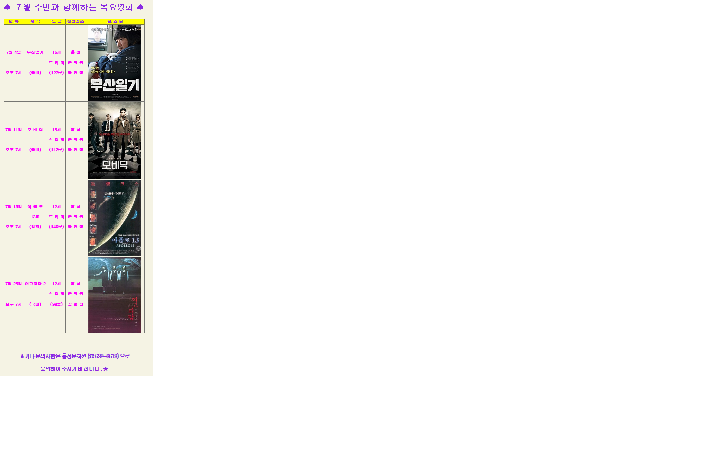 | 제목 | [영화상영] 2013 7월 주민과 함께하는 목요영화 안내 | ||||