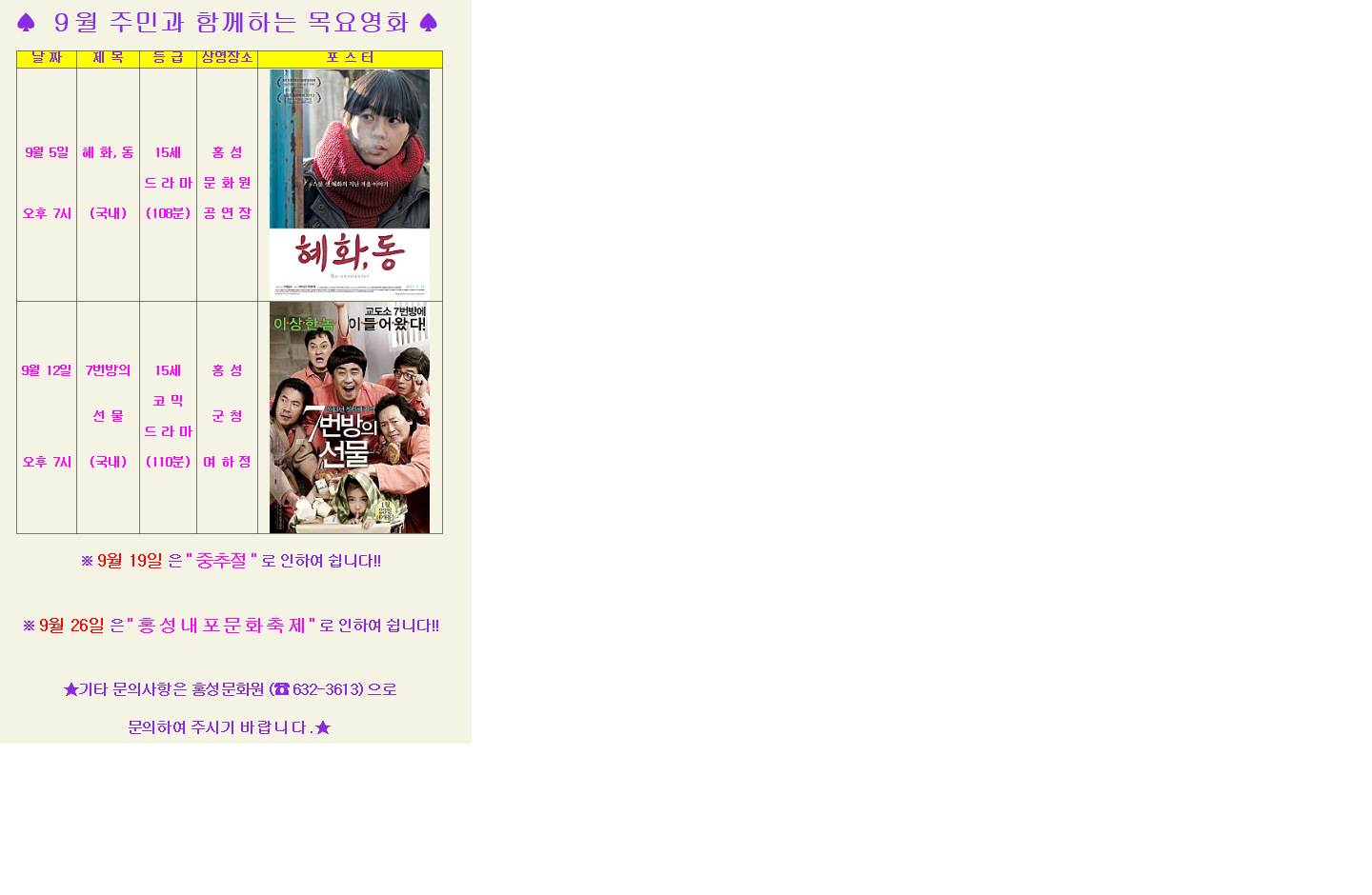 | 제목 | [영화상영] 2013 9월 주민과 함께하는 목요영화 안내 | ||||