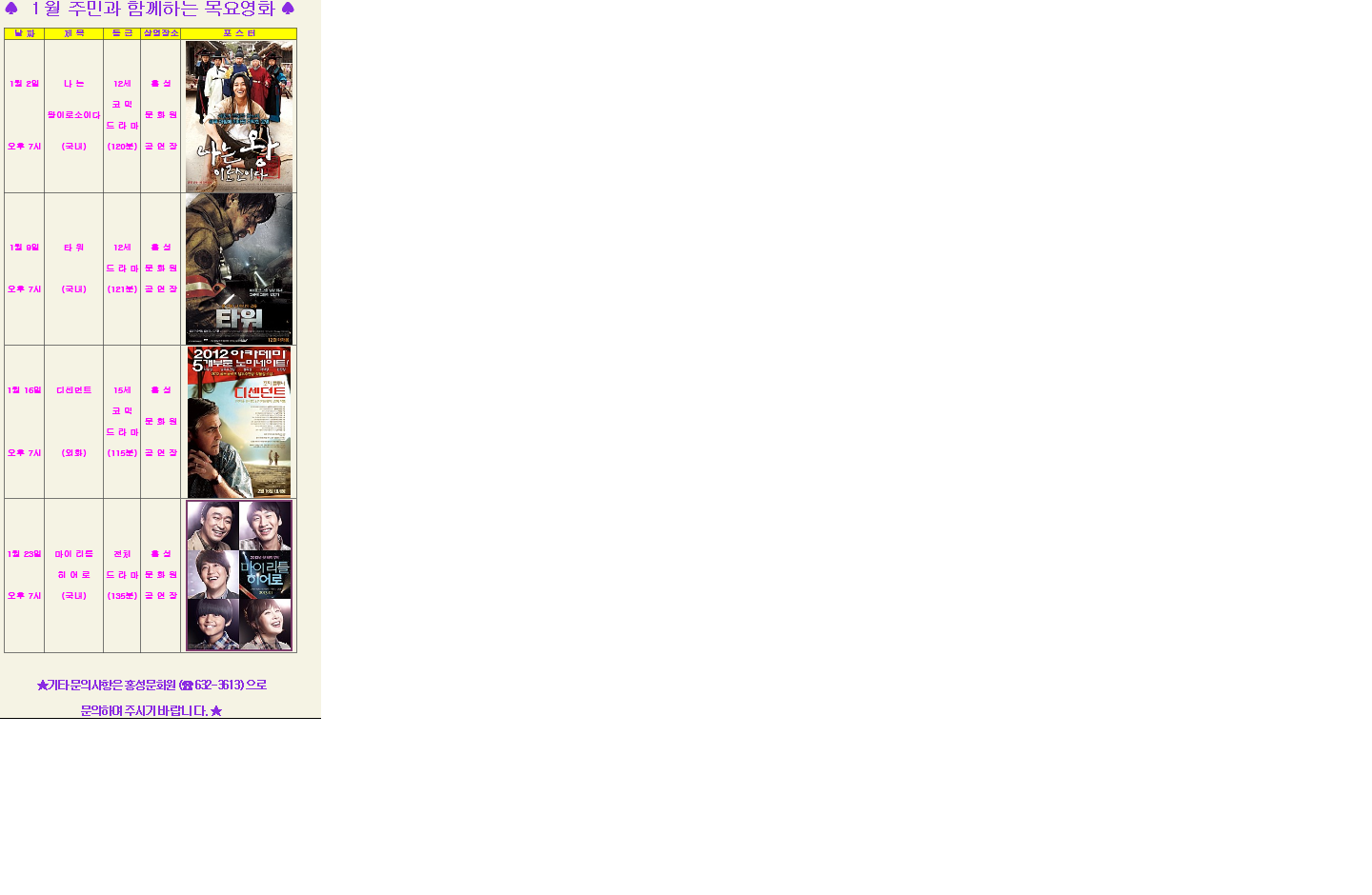 | 제목 | [영화상영] 2014 1월 주민과 함께하는 목요영화 안내 | ||||