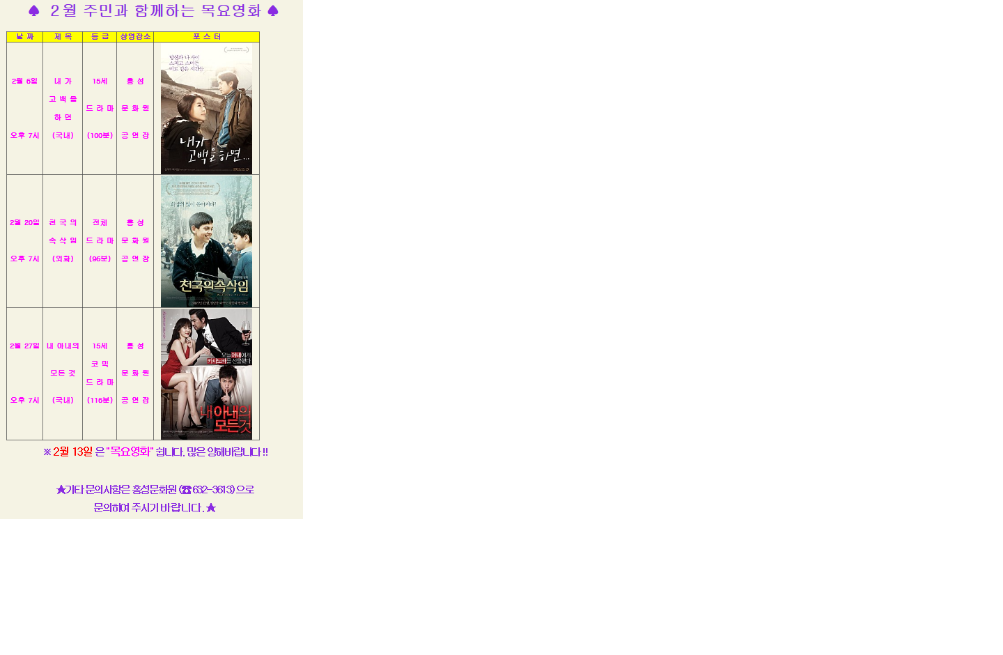 | 제목 | [영화상영] 2014 2월 주민과 함께하는 목요영화 안내 | ||||