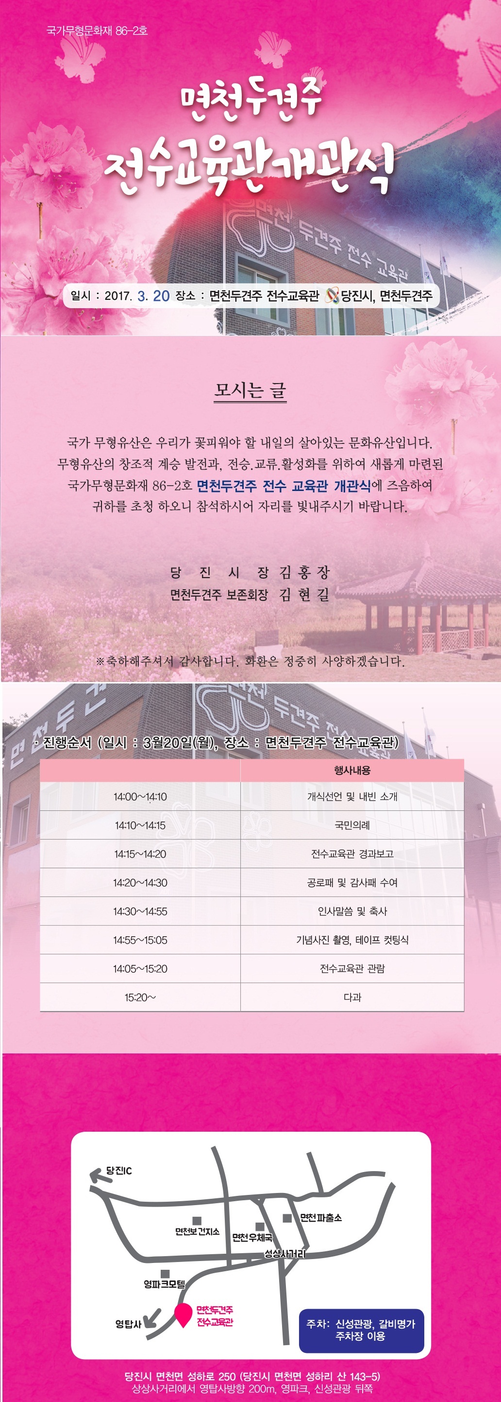 『 면천두견주 전수교육관 개관식 』글의 상세내용을 확인하는 표로 제목, 작성자, 등록일, 조회, 첨부, 내용으로 나뉘어 설명합니다.