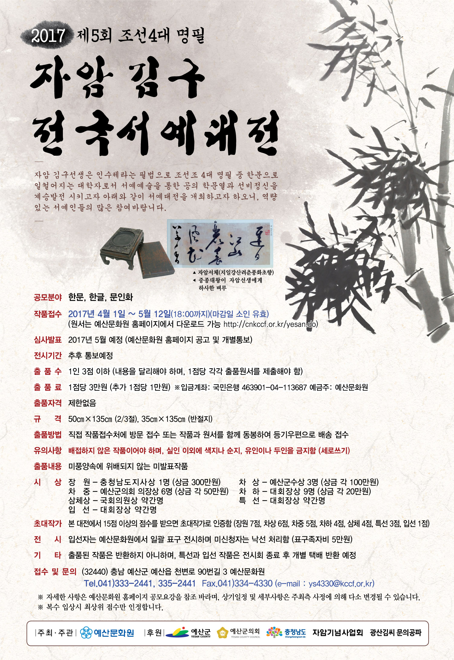 | 제목 | 2017 제5회 자암김구전국서예대전 안내 | ||||