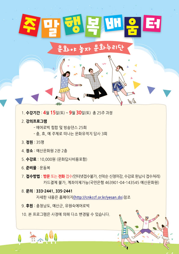 1. 수강기간 : 4월 15일(토) ~ 9월 30일(토) / 총25주과정 매주 토요일 오전10시~12시 수업 2. 강의프로그램 - 에어로빅, 힙합 및 방송댄스 25회 - 충, 효, 예 주제로 떠나는 문화유적지 답사 3회