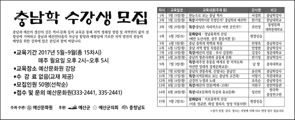 | 제목 | 2017년 충남학 수강생 모집 안내 | ||||