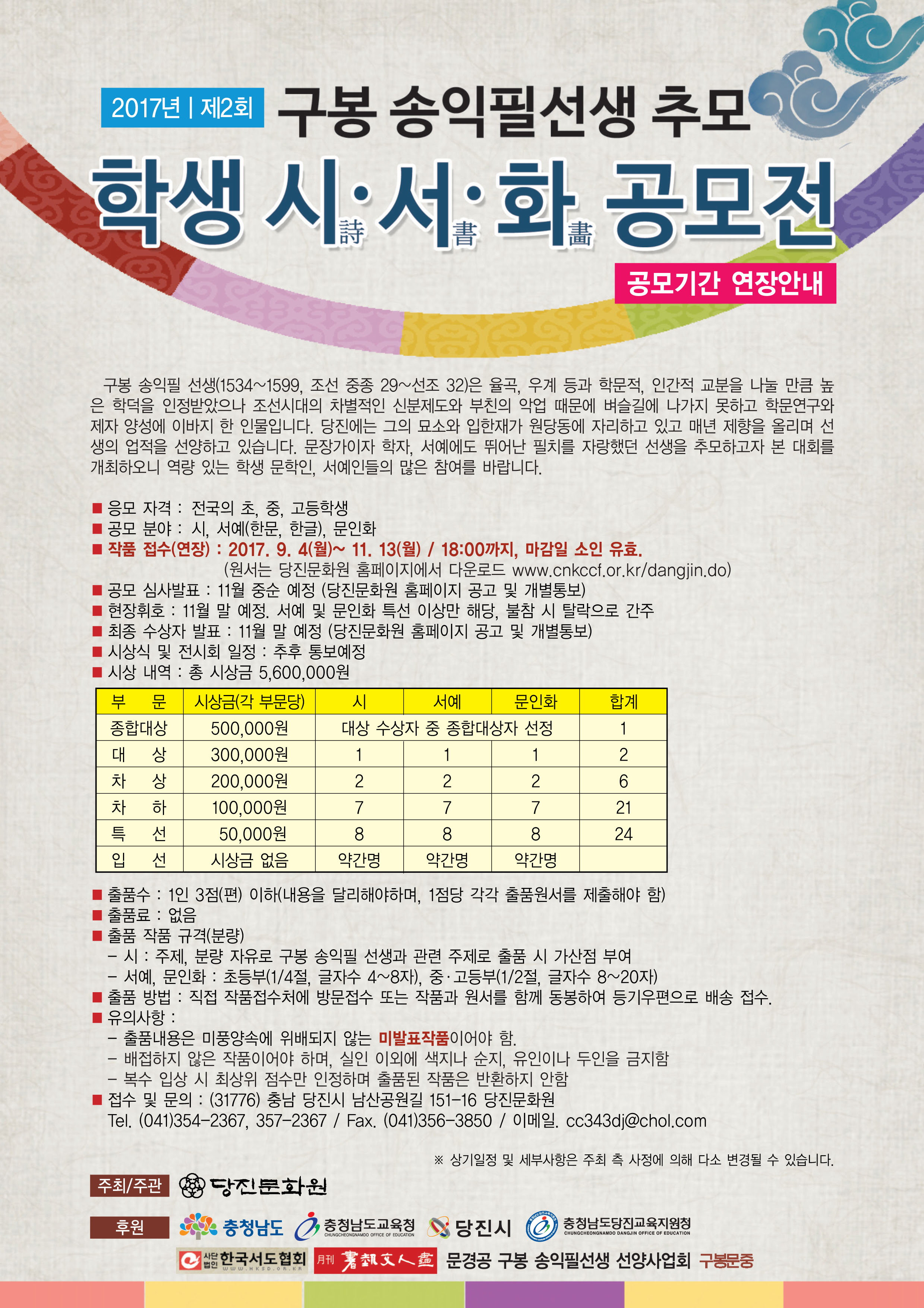 제2회 구봉 송익필 선생 추모 학생시서화 공모전과 관련하여 보다 많은 학생들이 참여할 수 있도록 공모기간을 당초 10월 23일에서 11월 13일까지 연장하여 진행하오니 많은 참여바랍니다.