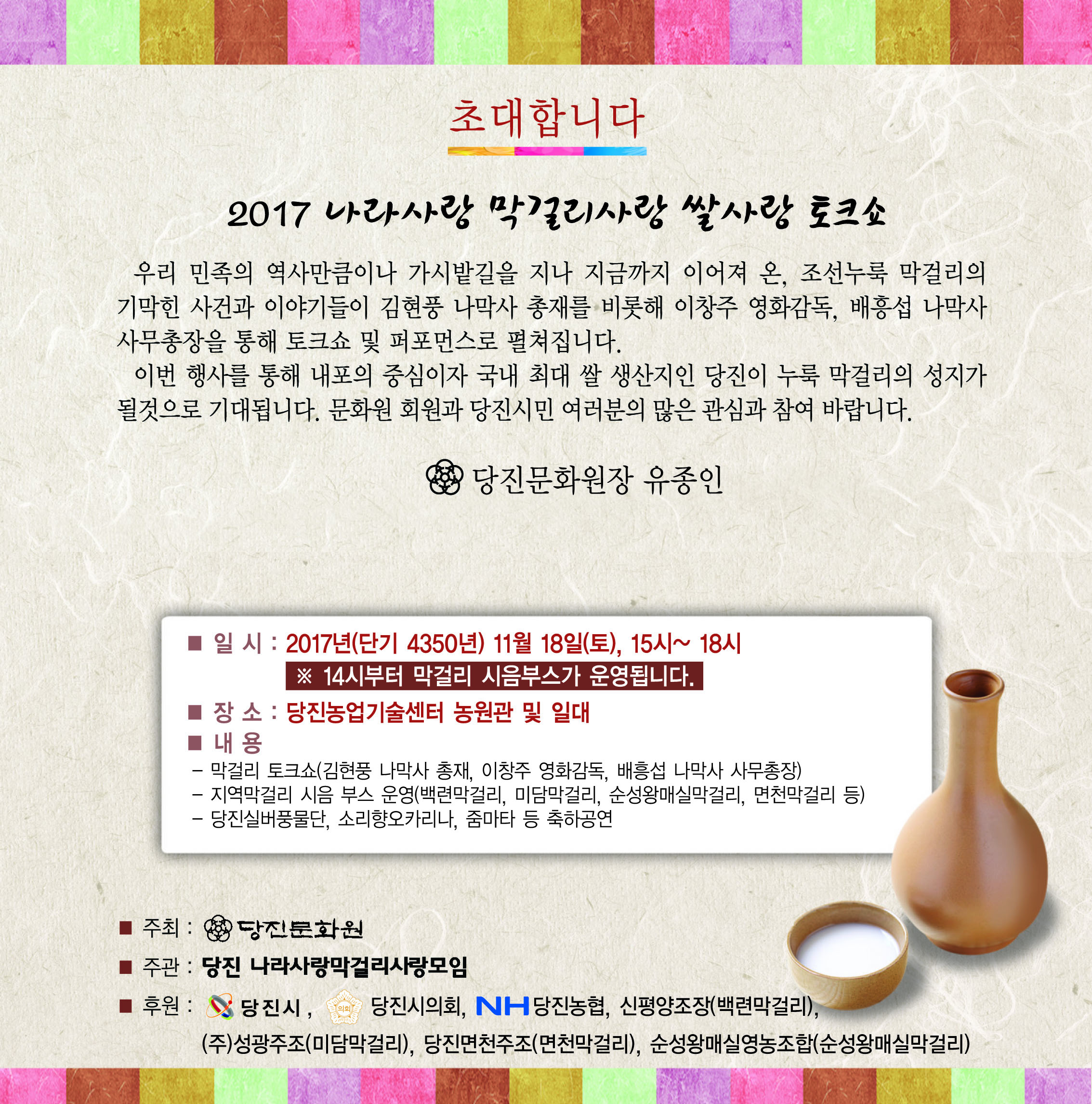 『 2017 나라사랑 막걸리사랑 쌀사랑 토크쇼 』글의 상세내용을 확인하는 표로 제목, 작성자, 등록일, 조회, 첨부, 내용으로 나뉘어 설명합니다.