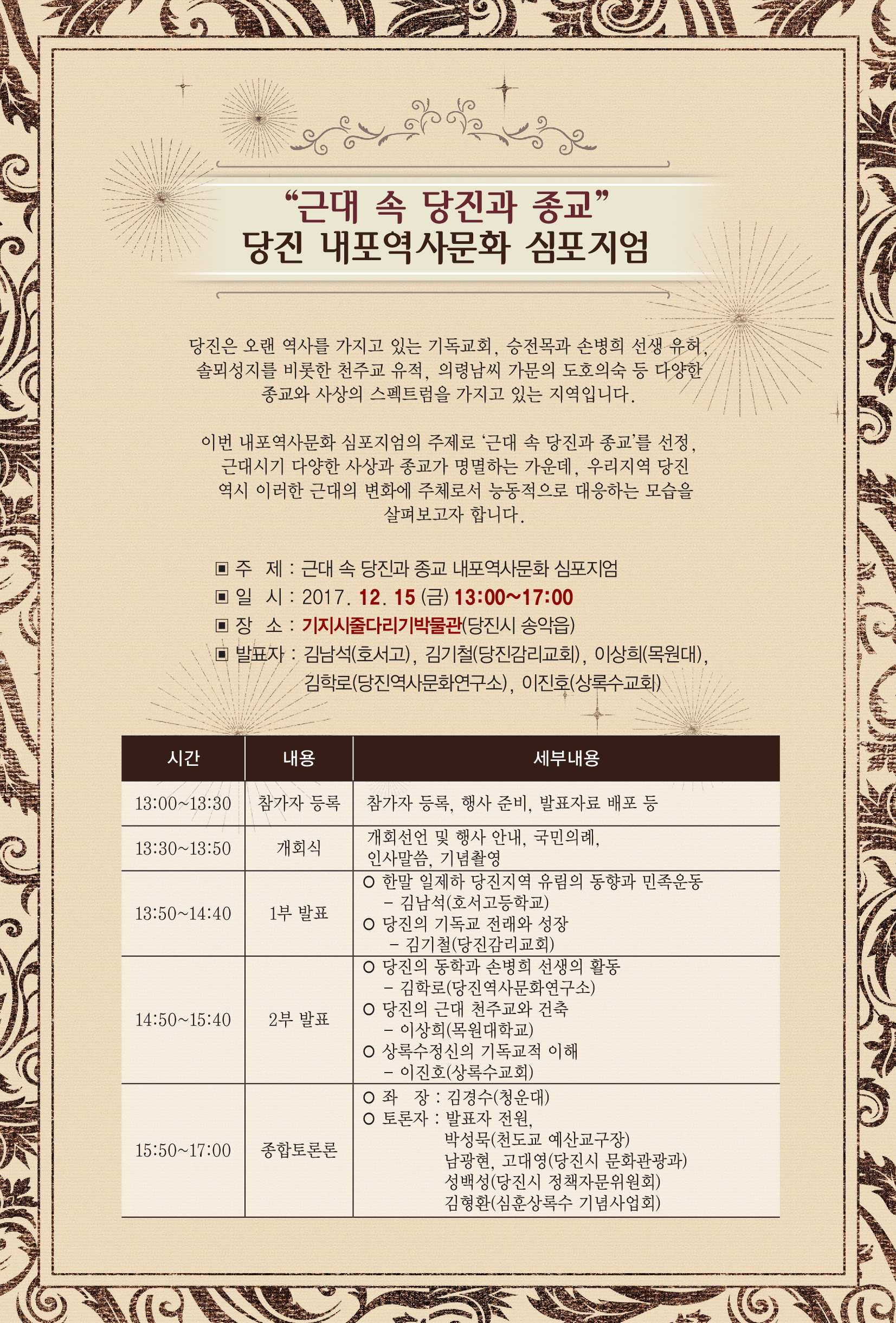 『 "근대 속 당진과 종교" 당진 내포역사문화 심포지엄 』글의 상세내용을 확인하는 표로 제목, 작성자, 등록일, 조회, 첨부, 내용으로 나뉘어 설명합니다.
