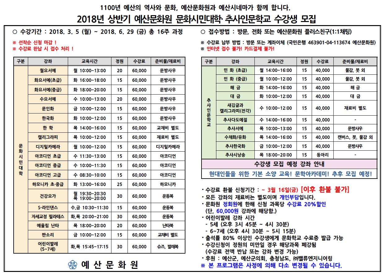 | 제목 | 2018 상반기 문화시민대학 & 추사시민대학 모집 안내 | ||||
