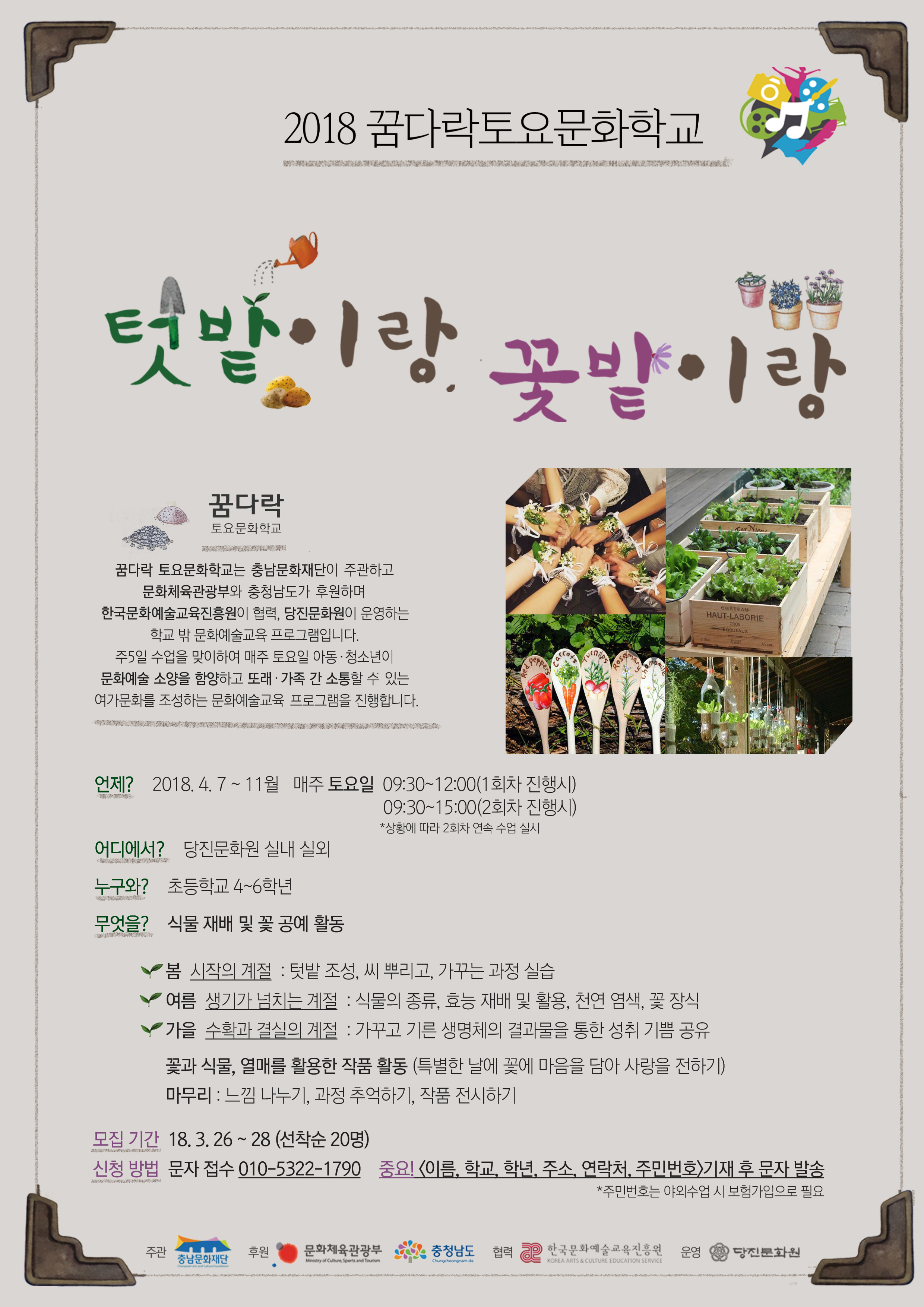 『 '텃밭이랑,꽃밭이랑' 꿈다락토요문화학교 모집 공고 』글의 상세내용을 확인하는 표로 제목, 작성자, 등록일, 조회, 첨부, 내용으로 나뉘어 설명합니다.