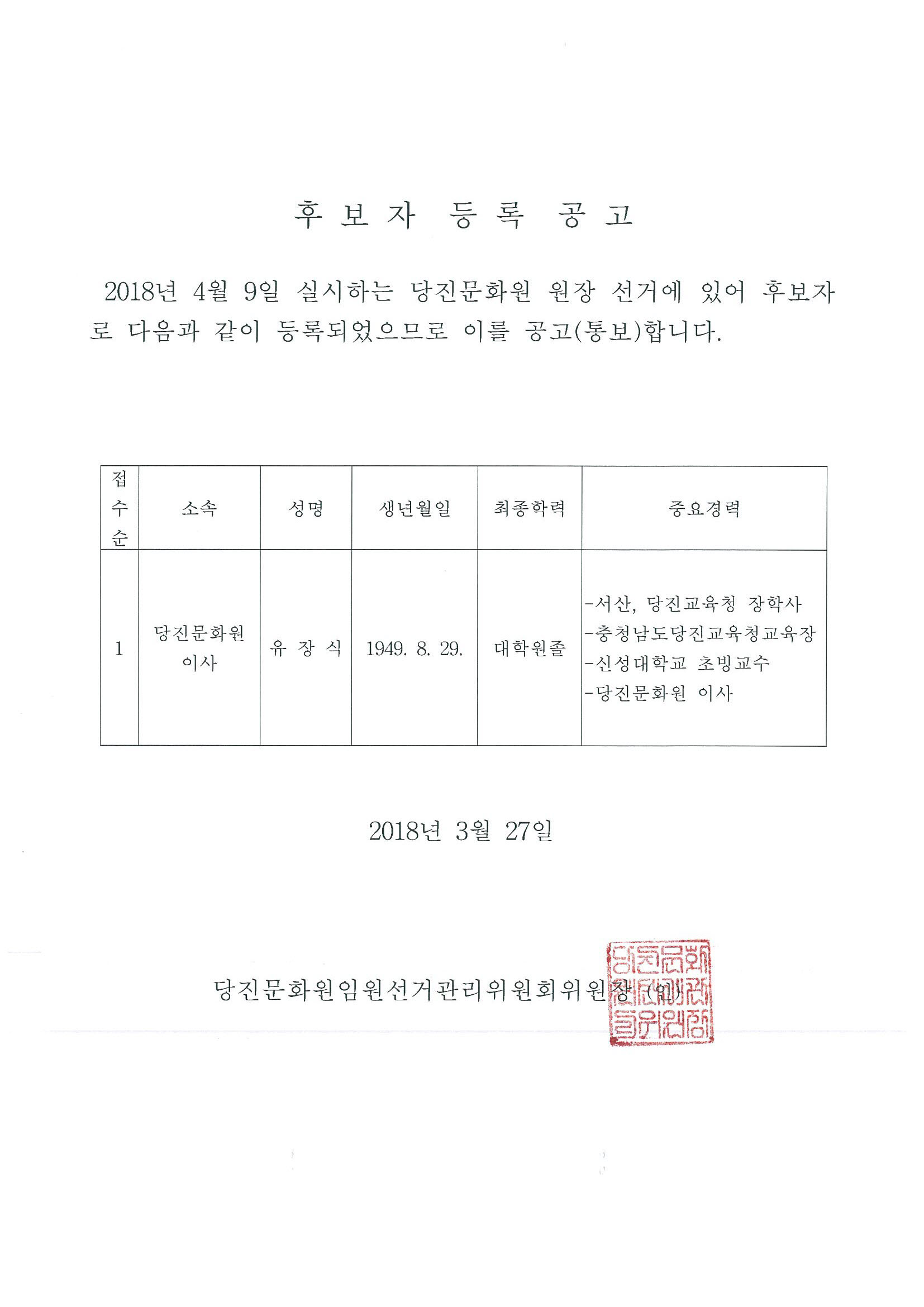 『 당진문화원장 후보자 등록 공고 』글의 상세내용을 확인하는 표로 제목, 작성자, 등록일, 조회, 첨부, 내용으로 나뉘어 설명합니다.