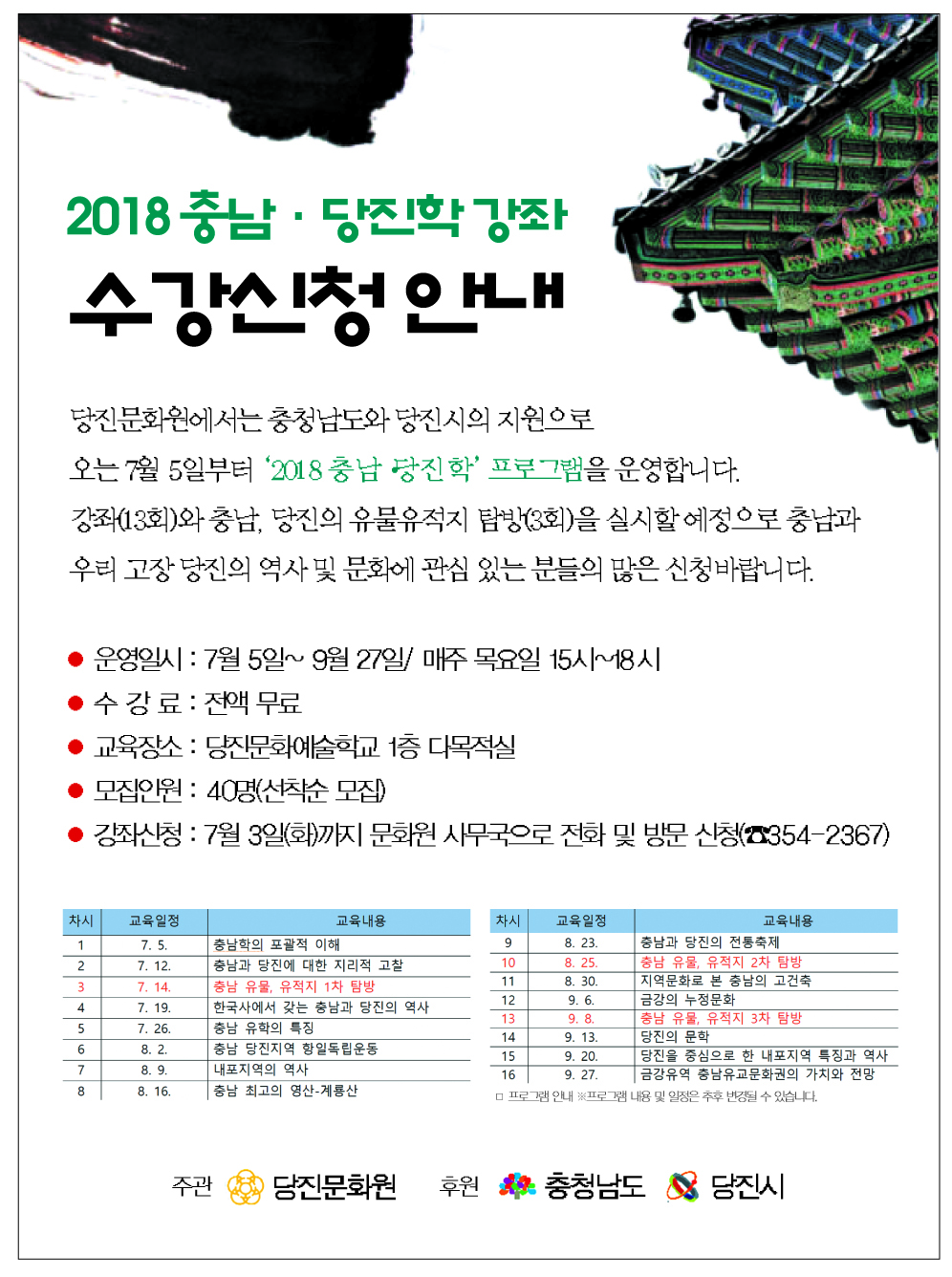 『 2018 충남·당진학 강좌 수강신청 안내 』글의 상세내용을 확인하는 표로 제목, 작성자, 등록일, 조회, 첨부, 내용으로 나뉘어 설명합니다.