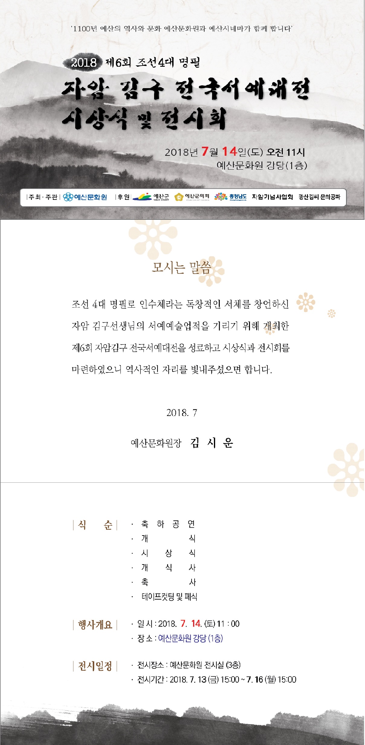 <제6회 자암 김구 전국서예대전 시상식 및 전시회 안내> 일시 : 2018년 7월 14일(토) 오전11시 장소 : 예산문화원 강당(1층)