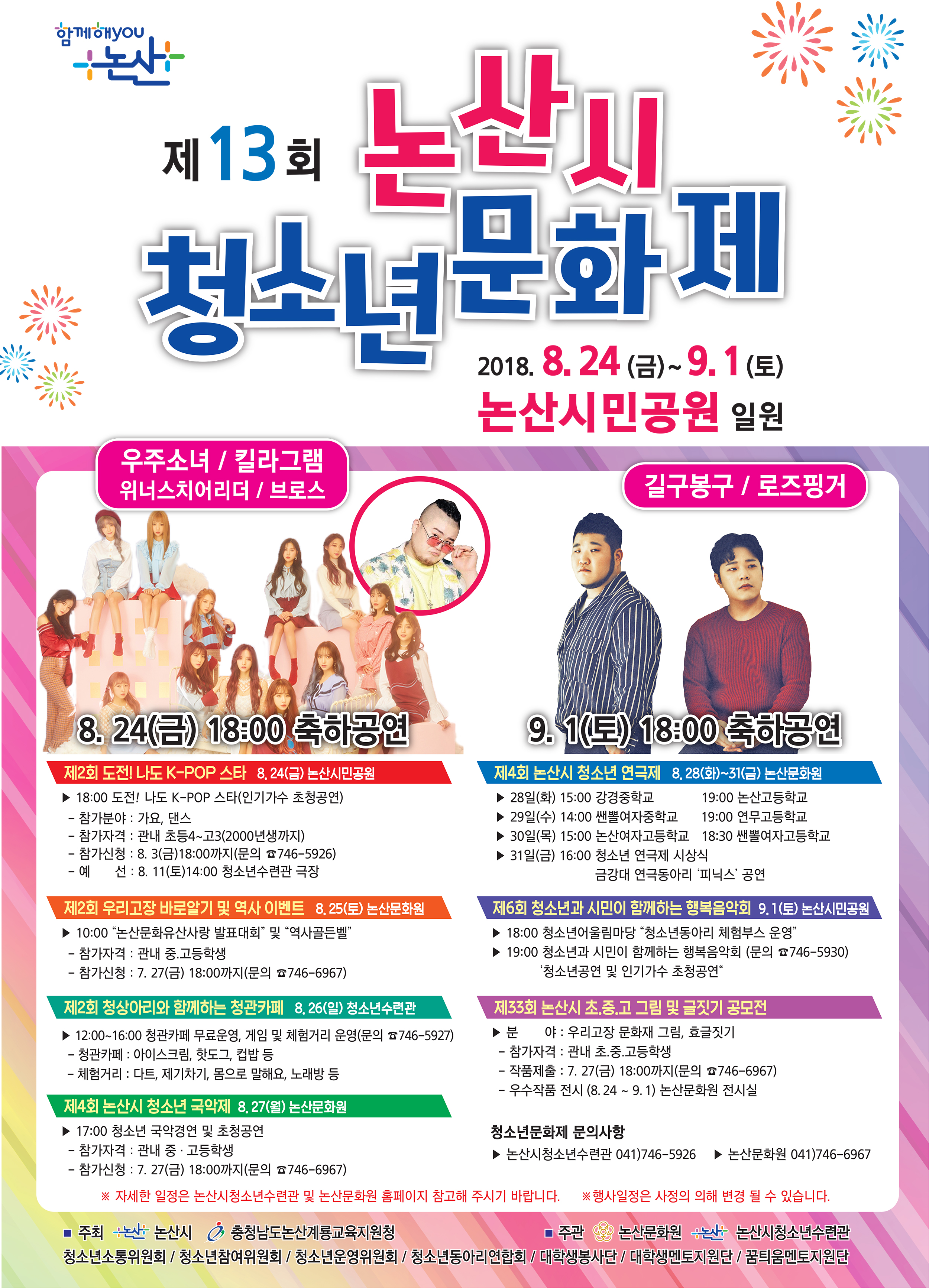 『 제13회 논산시 청소년문화제 』글의 상세내용을 확인하는 표로 제목, 작성자, 등록일, 조회, 첨부, 내용으로 나뉘어 설명합니다.
