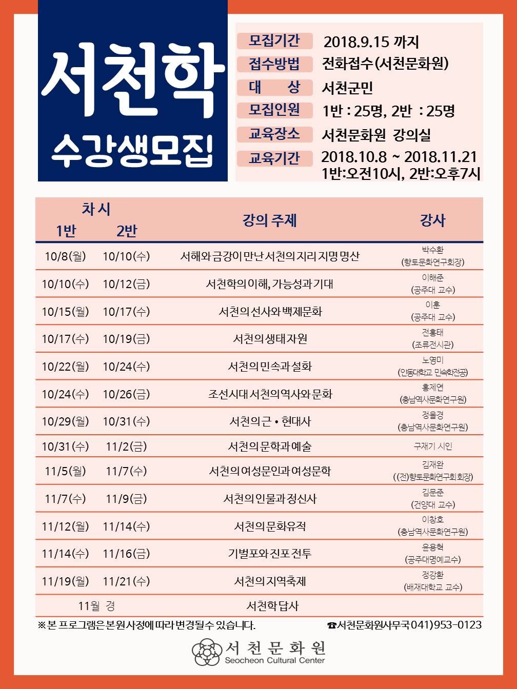『 2018 서천학 수강생 모집안내 』글의 상세내용을 확인하는 표로 제목, 작성자, 등록일, 조회, 첨부, 내용으로 나뉘어 설명합니다.