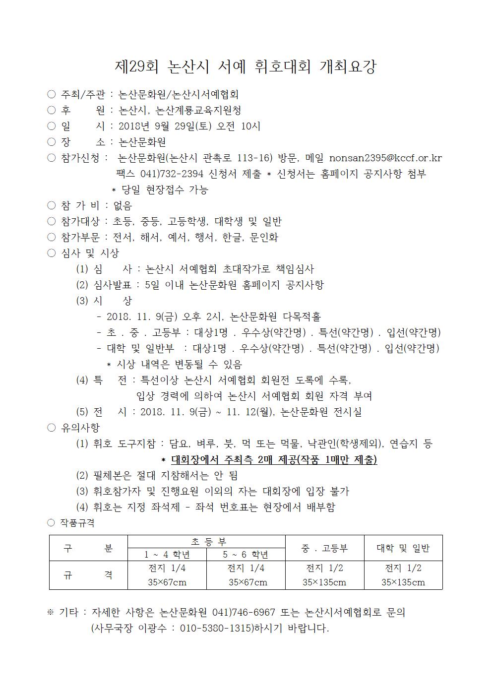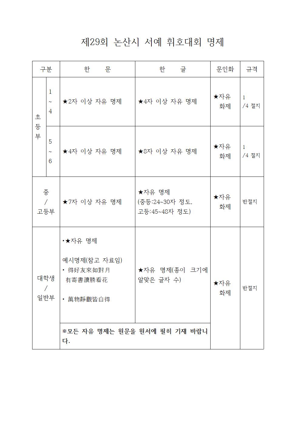 | 제목 | 제29회 논산시 서예 휘호대회 개최요강 | ||||