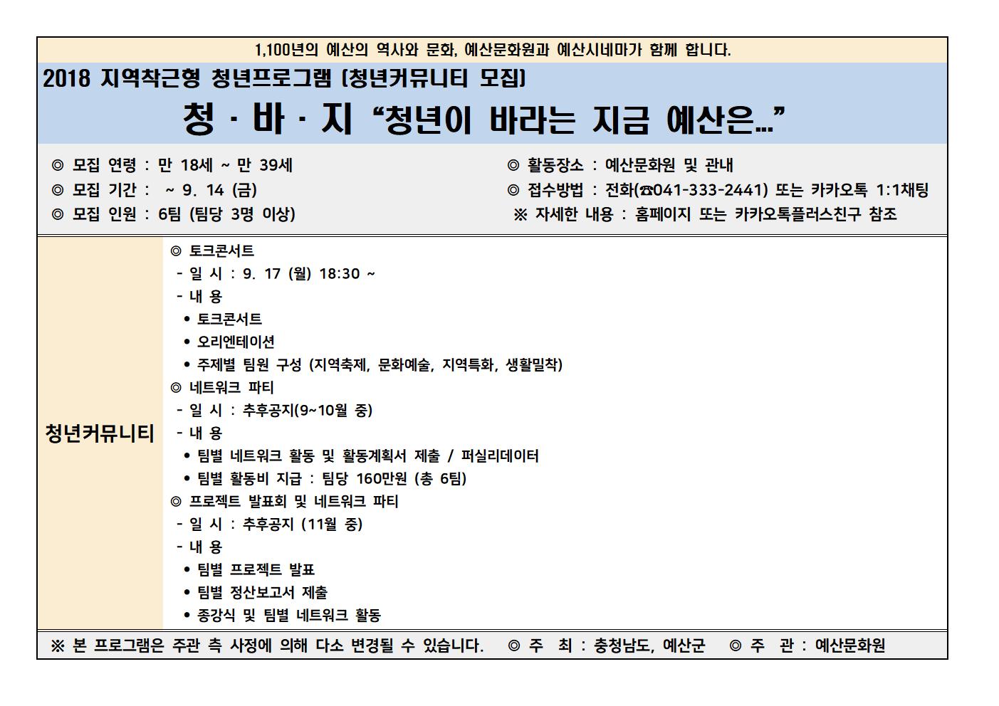 청·바·지 "청년이 바라는 지금 예산은..." # 모집 연령 : 만 18세 ~ 만 39세 # 모집 기간 : ~ 9. 14 (금) # 모집 인원 : 6팀 (팀당 3명 이상) # 커뮤니티 내용 ◎ 토크콘서트 : 9. 17 (월) ◎ 네트워크 파티 : 추후공지 ◎ 프로젝트 발표회 및 네트워크 파티 : 추후공지 # 활동 장소 : 예산문화원 및 관내 # 접수 방법 : 전화 (☎041-333-2441) 또는 카카오톡 1:1채팅 |