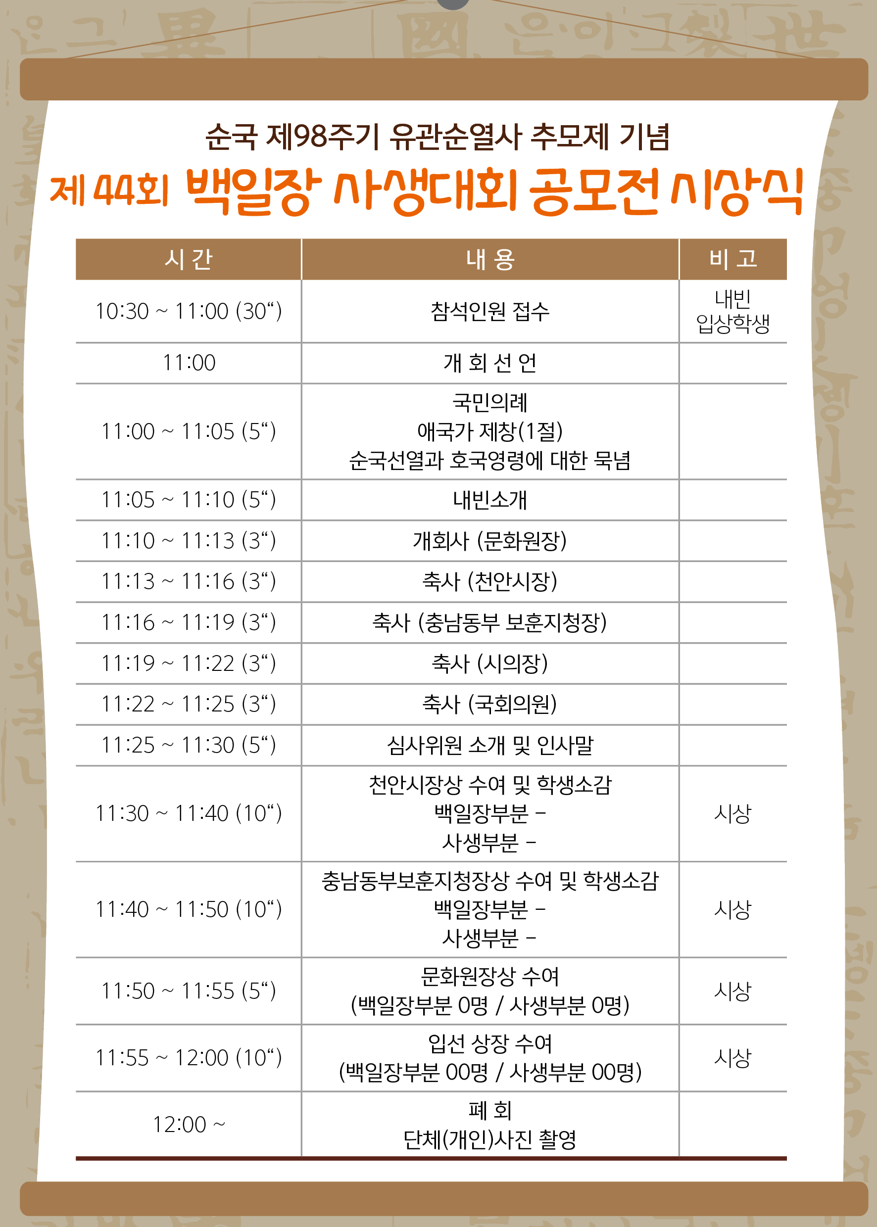 | 제목 | 제44회 백일장사생대회 공모전 시상식 일정 안내 | ||||