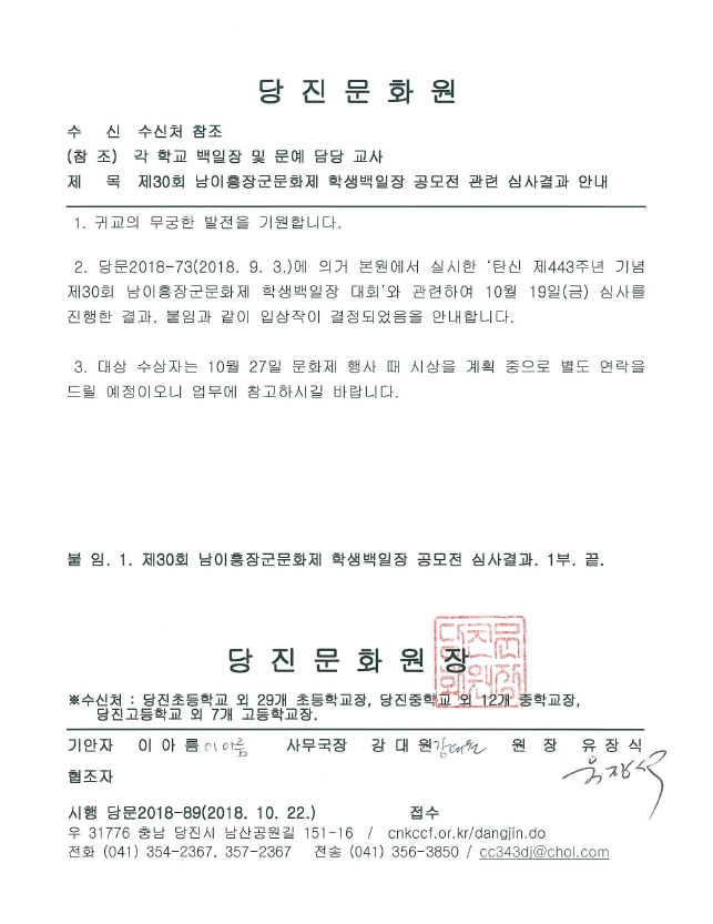 『 제30회 남이흥장군문화제 학생백일장 공모전 심사결과 안내 』글의 상세내용을 확인하는 표로 제목, 작성자, 등록일, 조회, 첨부, 내용으로 나뉘어 설명합니다.