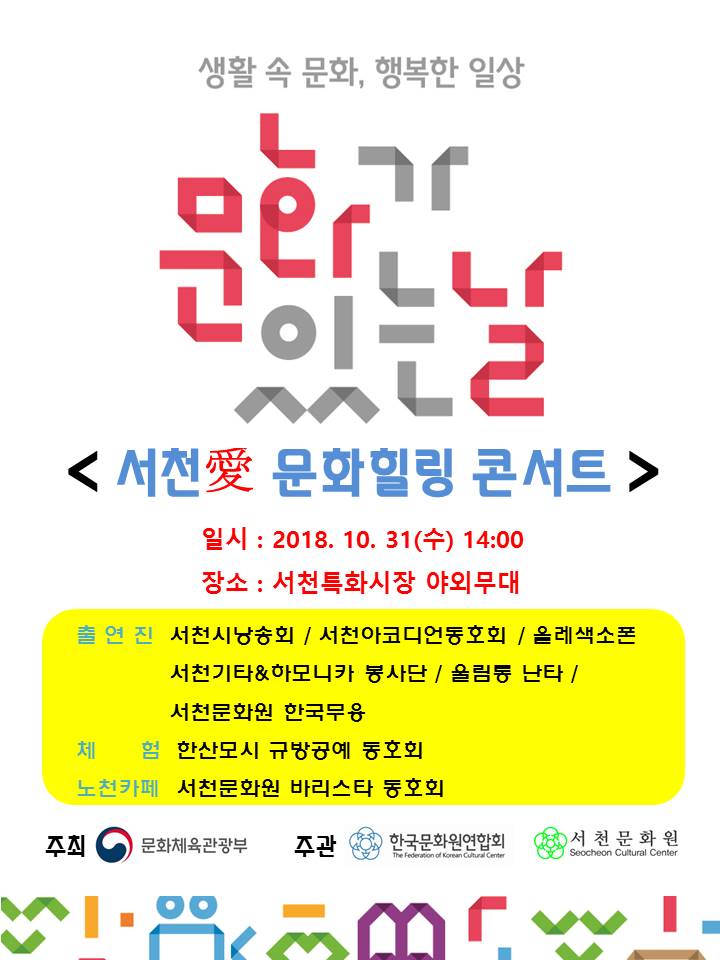 『 2018년 서천愛 문화힐링 콘서트 개최 』글의 상세내용을 확인하는 표로 제목, 작성자, 등록일, 조회, 첨부, 내용으로 나뉘어 설명합니다.