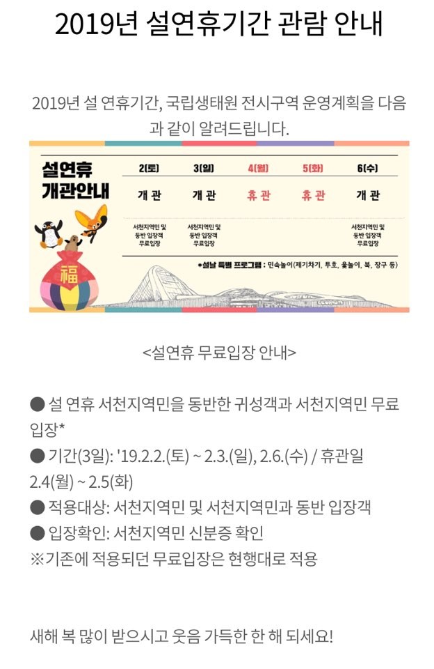 | 제목 | 국립생태원 2019년 설연휴기간 관람 안내 | ||||