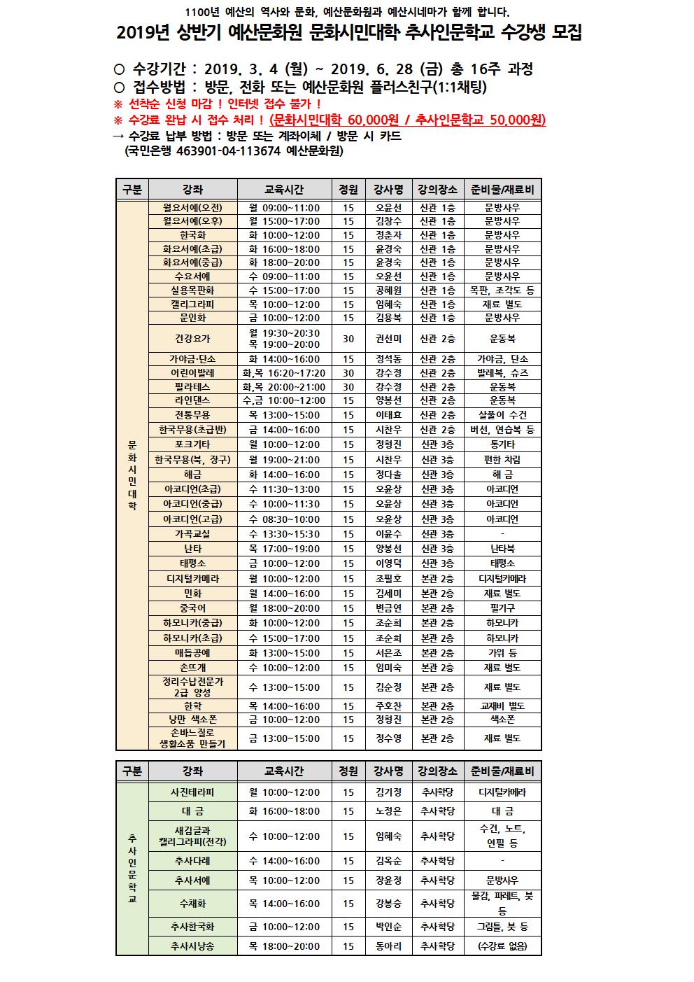 『 2019년 상반기 문화시민대학 및 추사인문학교 수강생 모집 』글의 상세내용을 확인하는 표로 제목, 작성자, 등록일, 조회, 첨부, 내용으로 나뉘어 설명합니다.