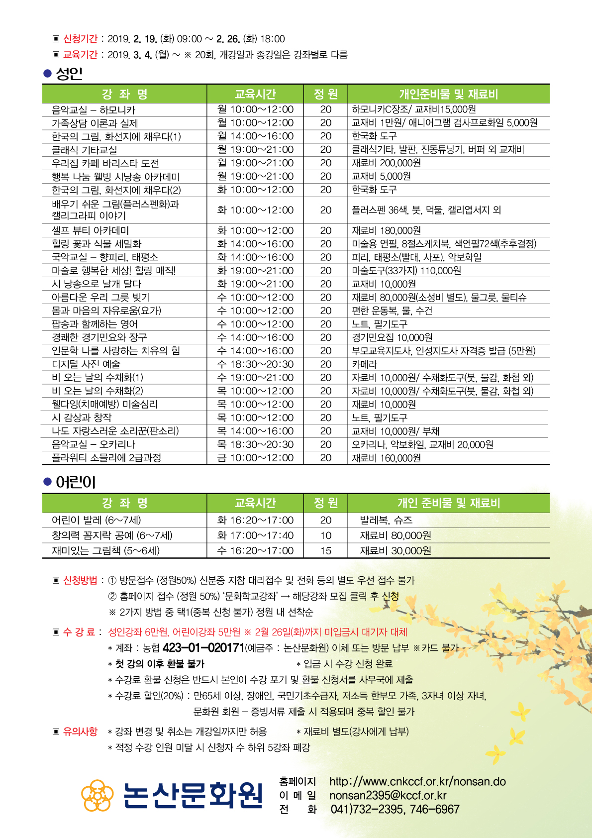 | 제목 | 2019 상반기 문화학교 수강 신청 안내 | ||||