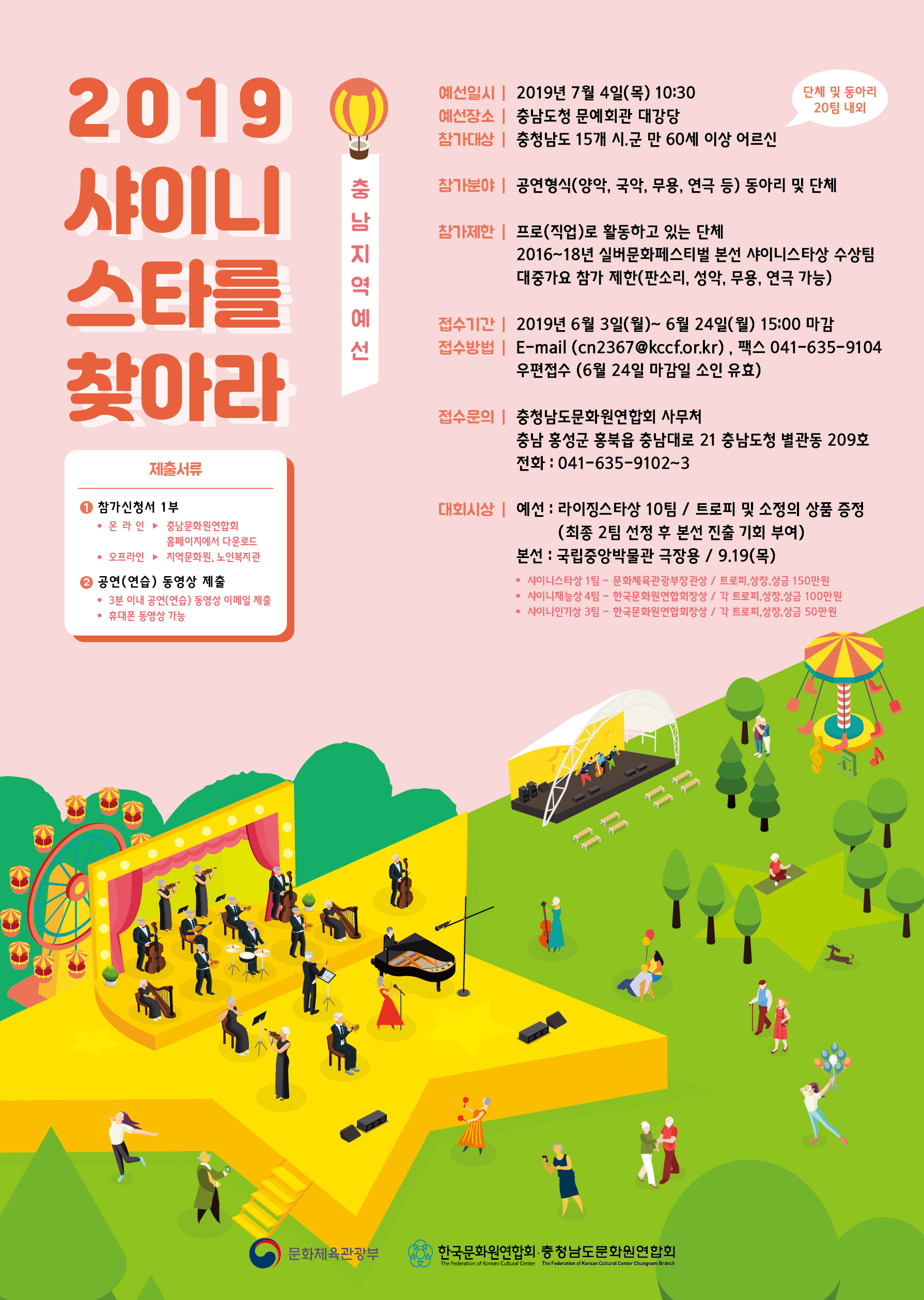 | 제목 | 2019 실버문화페스티벌 '샤이니스타를 찾아라' 충남지역예선 안내 | ||||