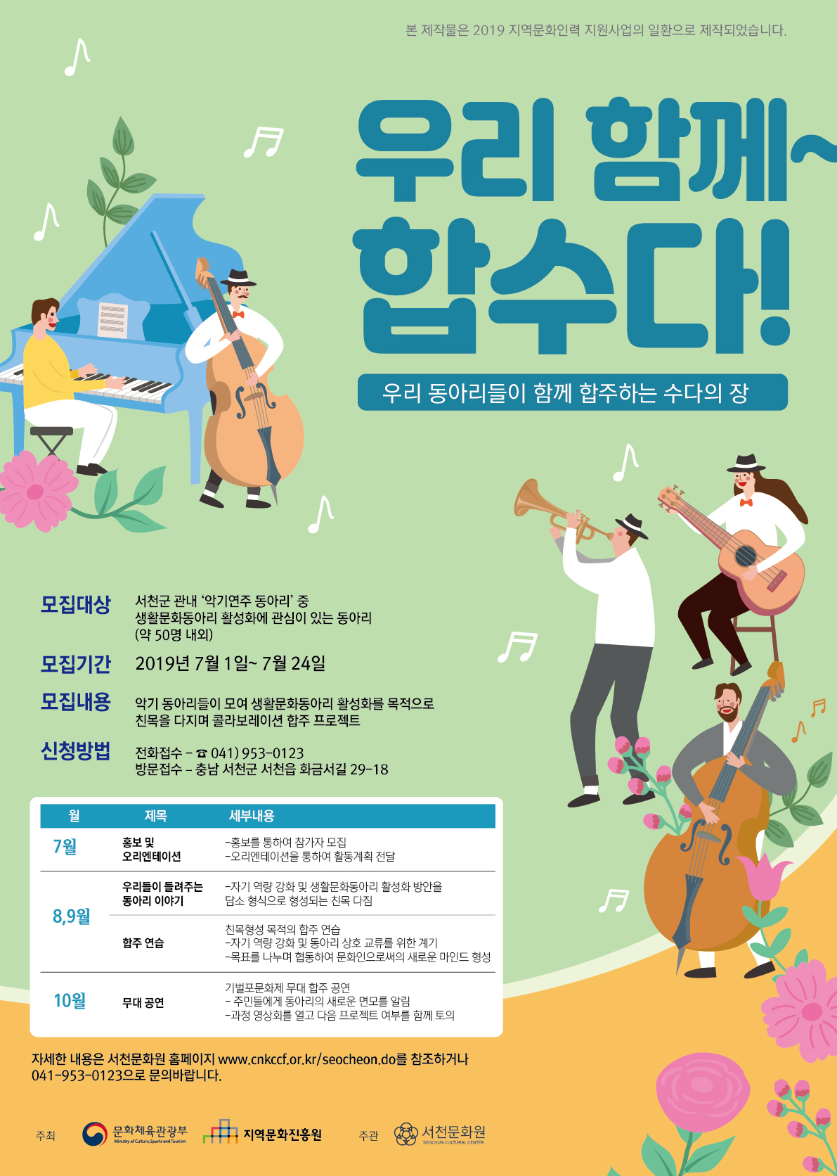 『 우리 함께 합수다 (악기연주 생활문화동아리) 모집공고 』글의 상세내용을 확인하는 표로 제목, 작성자, 등록일, 조회, 첨부, 내용으로 나뉘어 설명합니다.