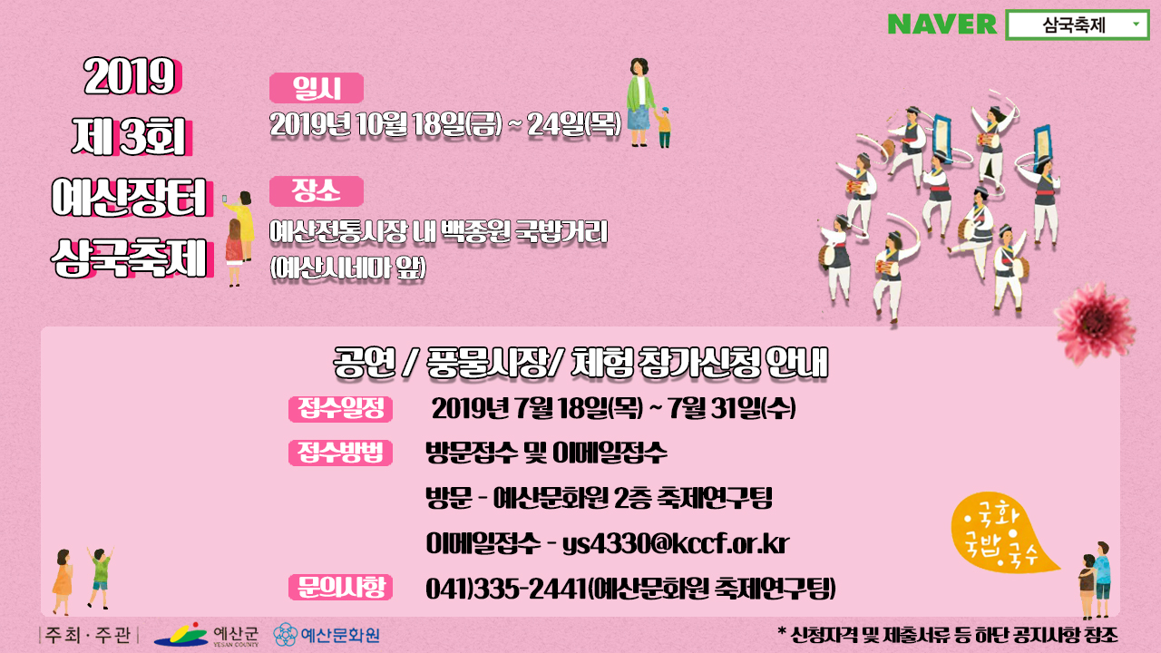 | 제목 | 2019 제3회 예산장터 삼국축제 프로그램 참가 단체 공고 | ||||