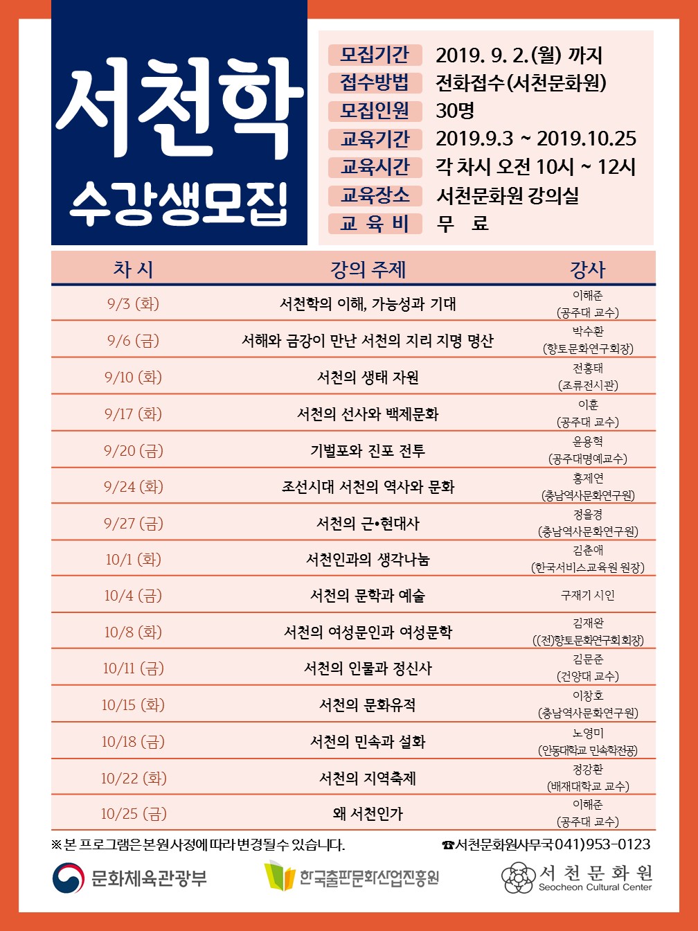 모집기간 : 2019. 9. 2 까지 접수방법 : 전화접수 (서천문화원 사무국 : 041-953-0123) 모집인원 : 30명 교육기간 : 2019. 9. 3. ~ 2019. 10. 25. 교육시간 : 각 차시 오전 10시 ~12시 교육장소 : 서천문화원 강의실 교 육 비 : 무료