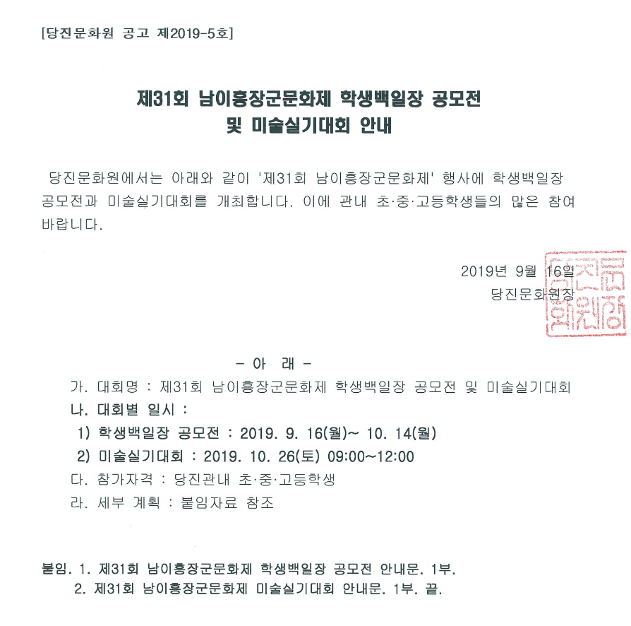 | 제목 | 제31회 남이흥장군문화제 학생백일장 공모전 및 미술실기대회 안내 | ||||