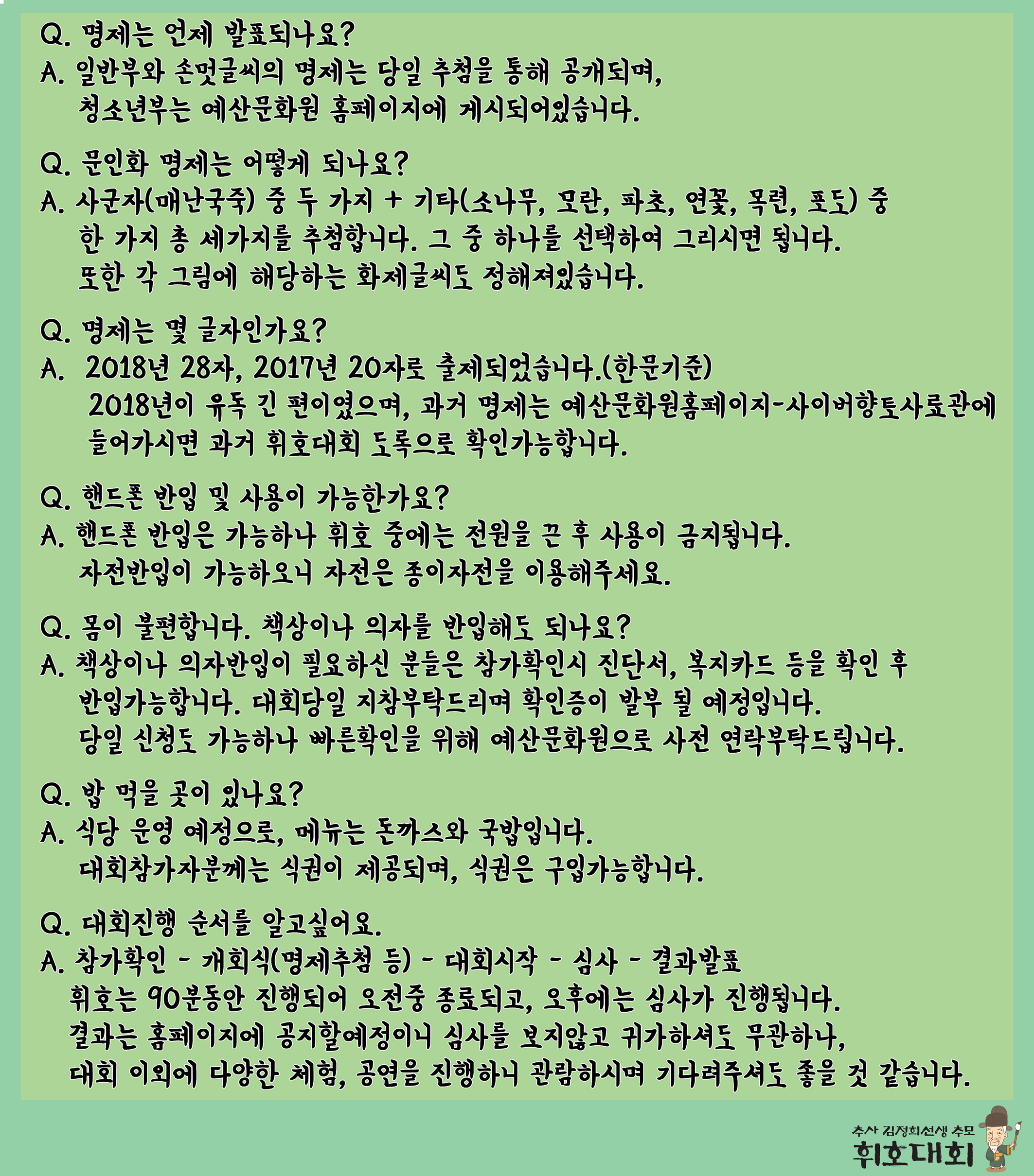 『 제30회 추사휘호대회 안내 및 Q&A 』글의 상세내용을 확인하는 표로 제목, 작성자, 등록일, 조회, 첨부, 내용으로 나뉘어 설명합니다.