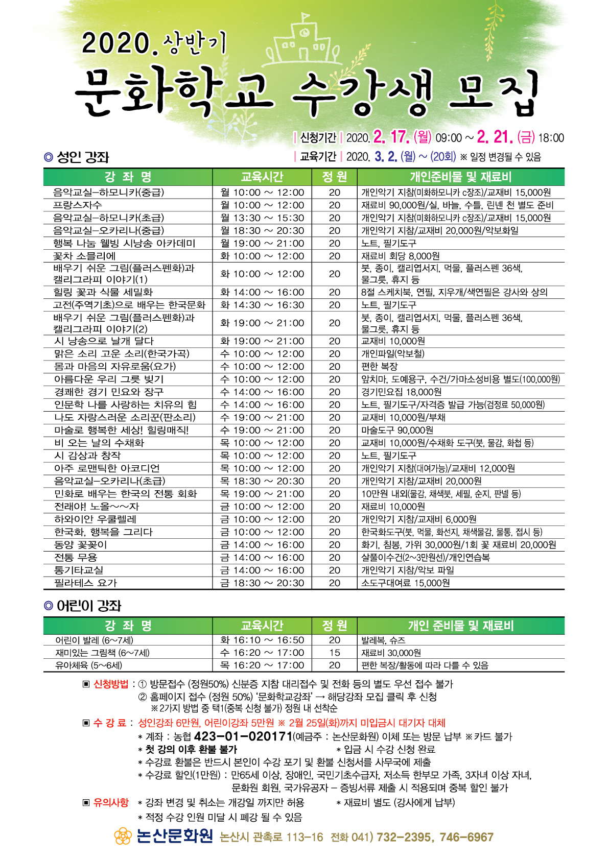 | 제목 | 2020 상반기 문화학교 수강생 모집 | ||||