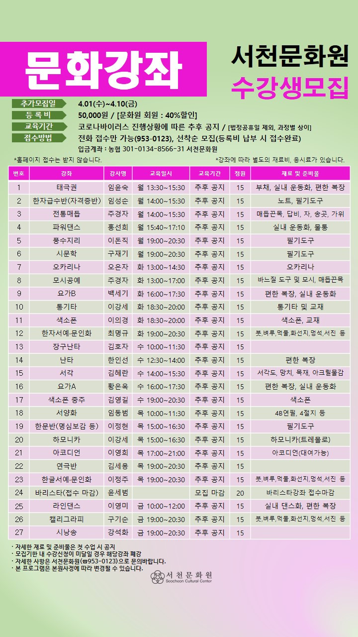 서천문화원에서 5월 15일(금)에 2020 문화강좌 수강생 모집마감을 합니다.