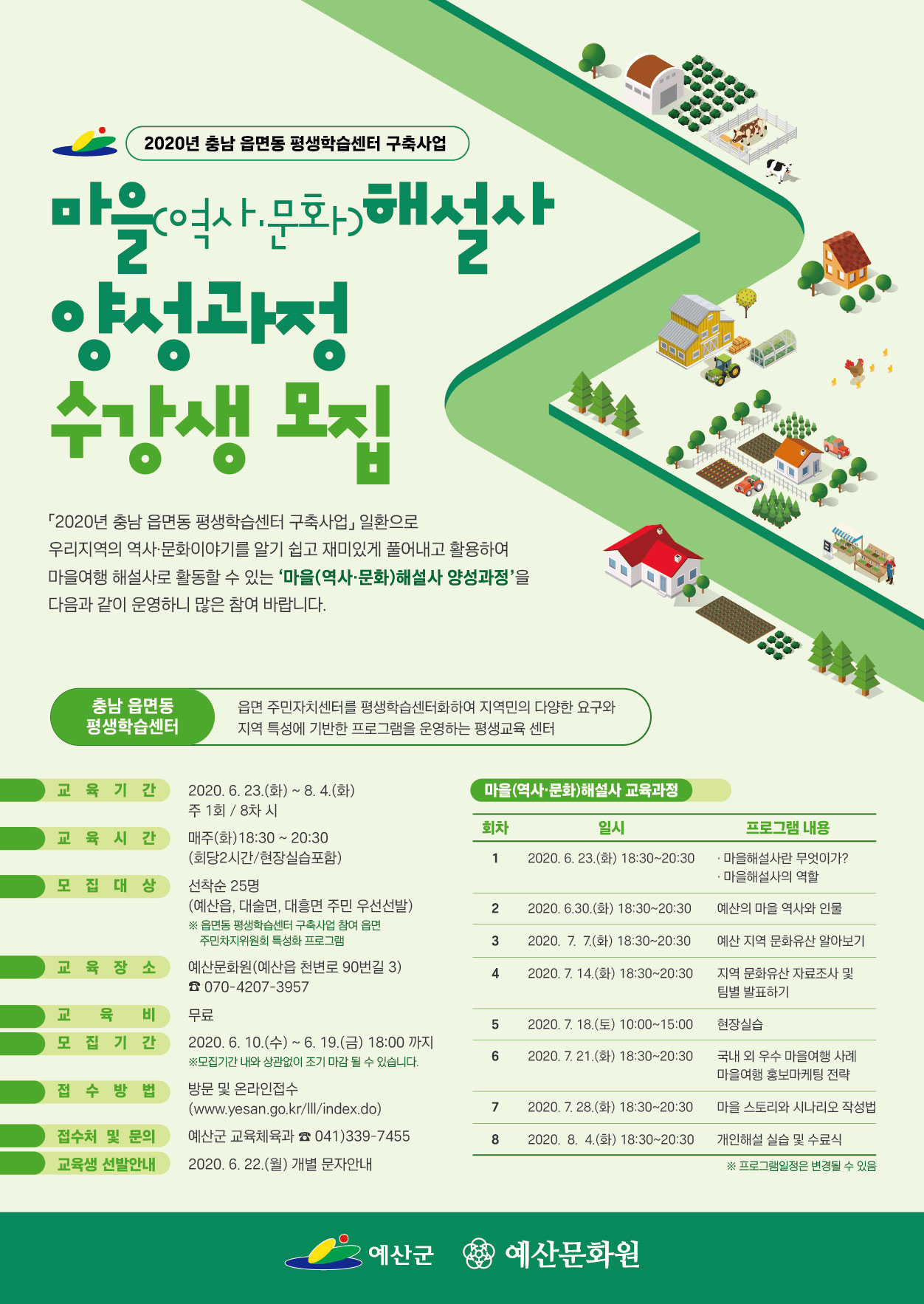 [2020년 충남 읍면동 평생학습센터 구축사업] 일환으로 우리지역의 역사 · 문화이야기를 알기 쉽고 재미있게 풀어내고 활용하여 마을여행 해설사로 활동할 수 있는'마을(역사 · 문화))해설사 양성과정'을 다음과 같이 운영하니 많은 참여 바랍니다.