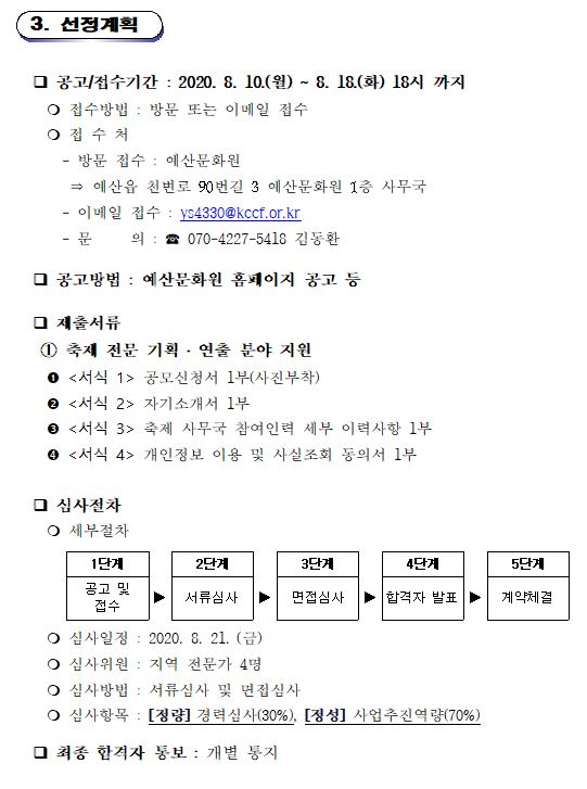 예산군 대표 축제로 자리매김한 제 4회 예산장터 삼국축제의 성공적인 개최를 위해 아래와 같이 역량 있는 축제 전문 기획, 연출자 채용을 붙임과 같이 하오니 많은 관심과 지원 바랍니다.