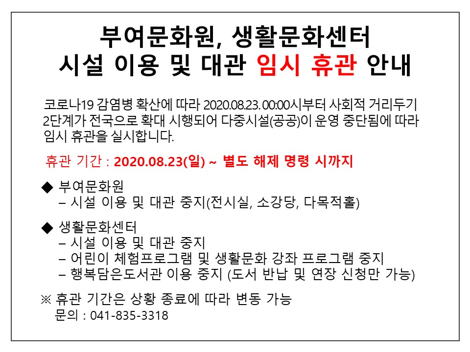 『 부여문화원, 생활문화센터 임시 휴관 안내 』글의 상세내용을 확인하는 표로 제목, 작성자, 등록일, 조회, 첨부, 내용으로 나뉘어 설명합니다.