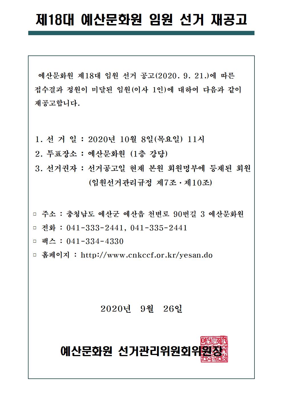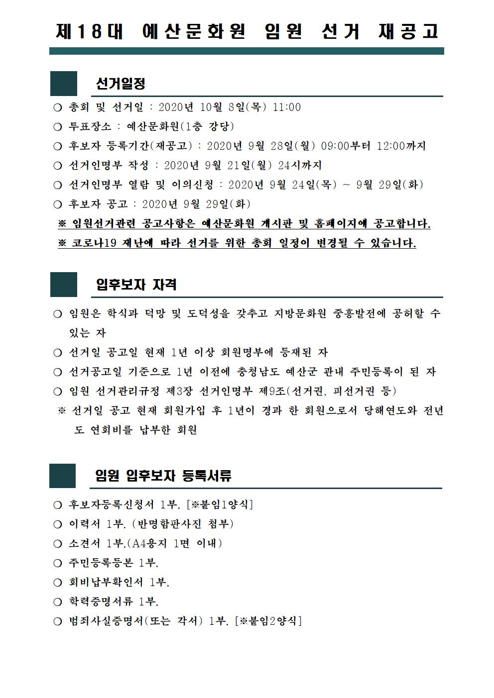 | 제목 | [재공고] 제18대 예산문화원 임원 선거 재공고 | ||||