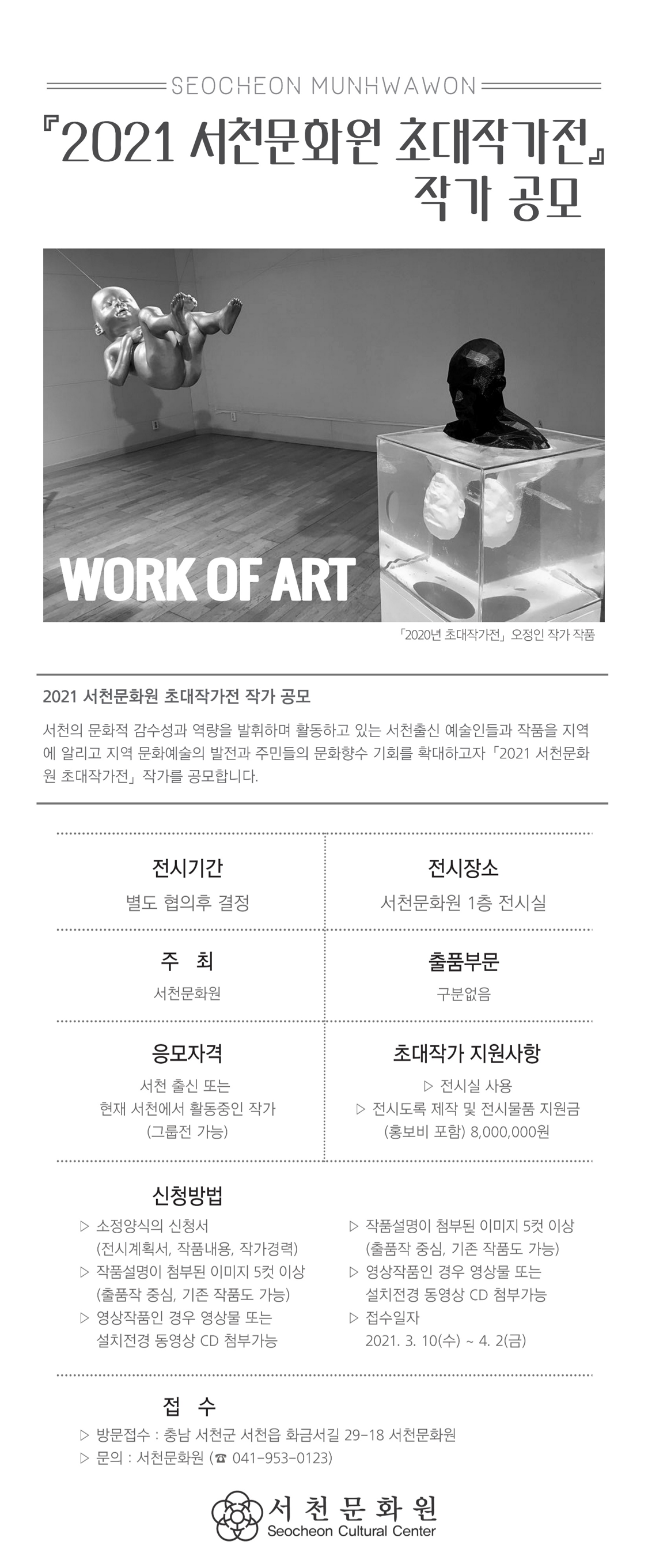 | 제목 | '2021 서천문화원 초대작가전' 작가 공모 요강 안내 | ||||