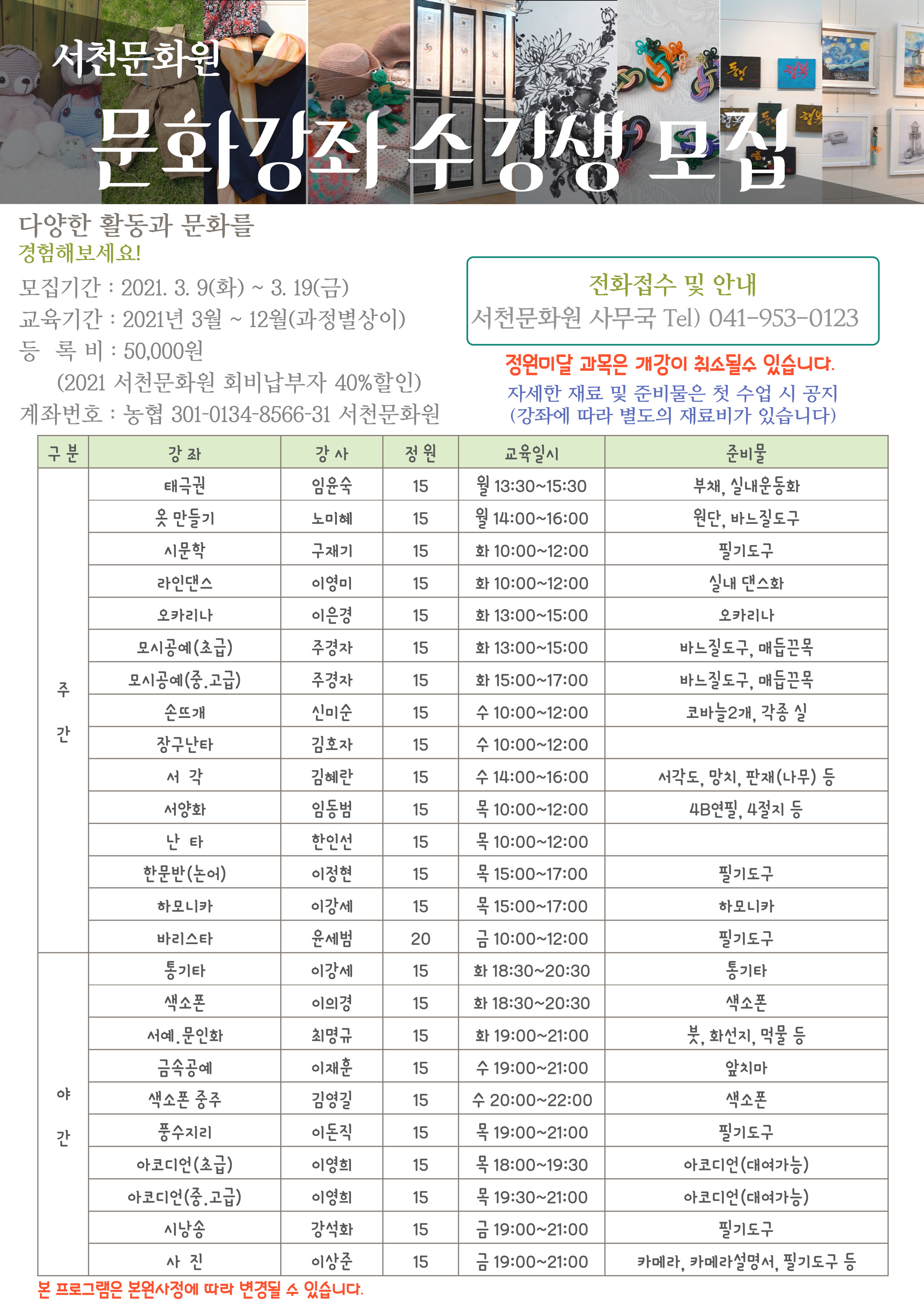 『 2021 서천문화원 문화강좌 수강생 모집공고 』글의 상세내용을 확인하는 표로 제목, 작성자, 등록일, 조회, 첨부, 내용으로 나뉘어 설명합니다.