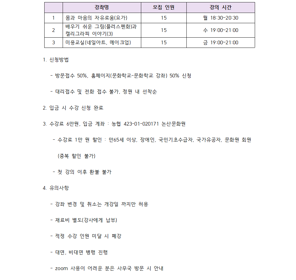 『 2021. 상반기 문화학교 추가 강좌 모집 』글의 상세내용을 확인하는 표로 제목, 작성자, 등록일, 조회, 첨부, 내용으로 나뉘어 설명합니다.