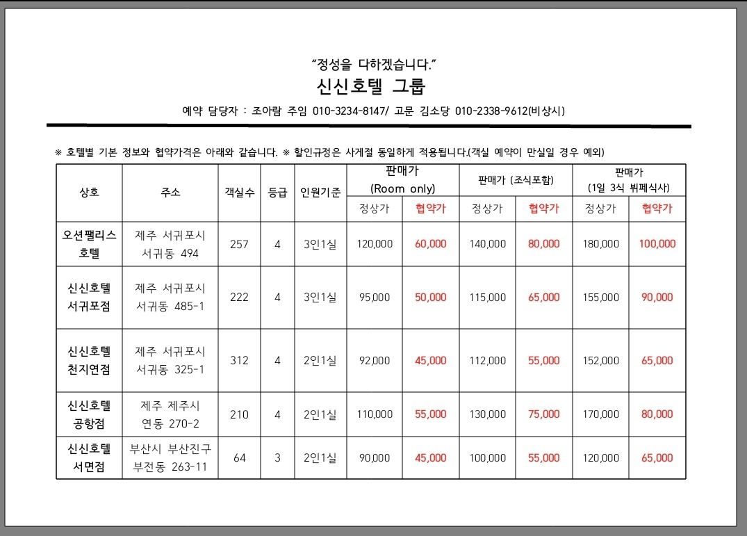 2. 활용가능 호텔 : 신신호텔 그룹 산하 5개 호텔(제주시, 서귀포, 부산)