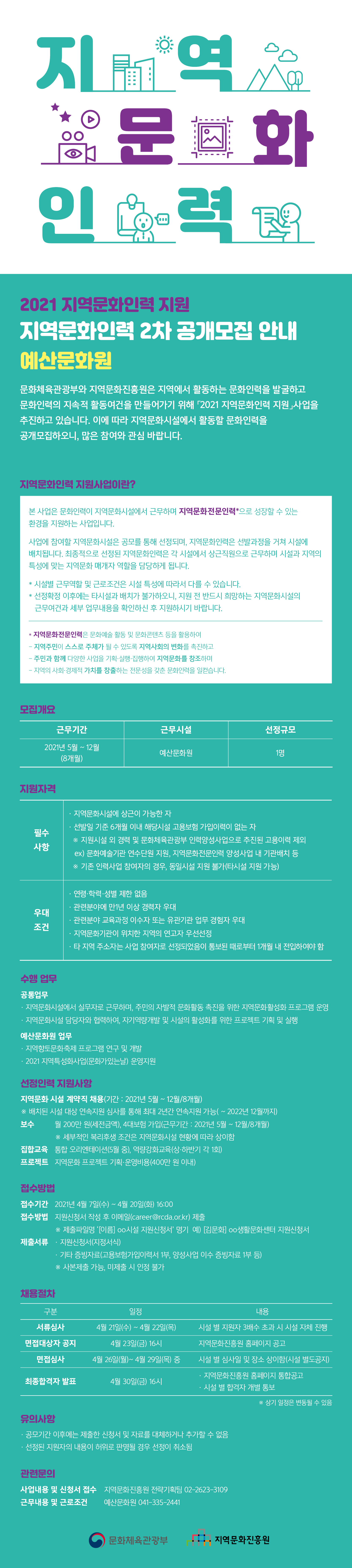 | 제목 | [2021 지역문화인력 지원 사업] 예산문화원 지역문화인력 2차 공개모집 안내 | ||||