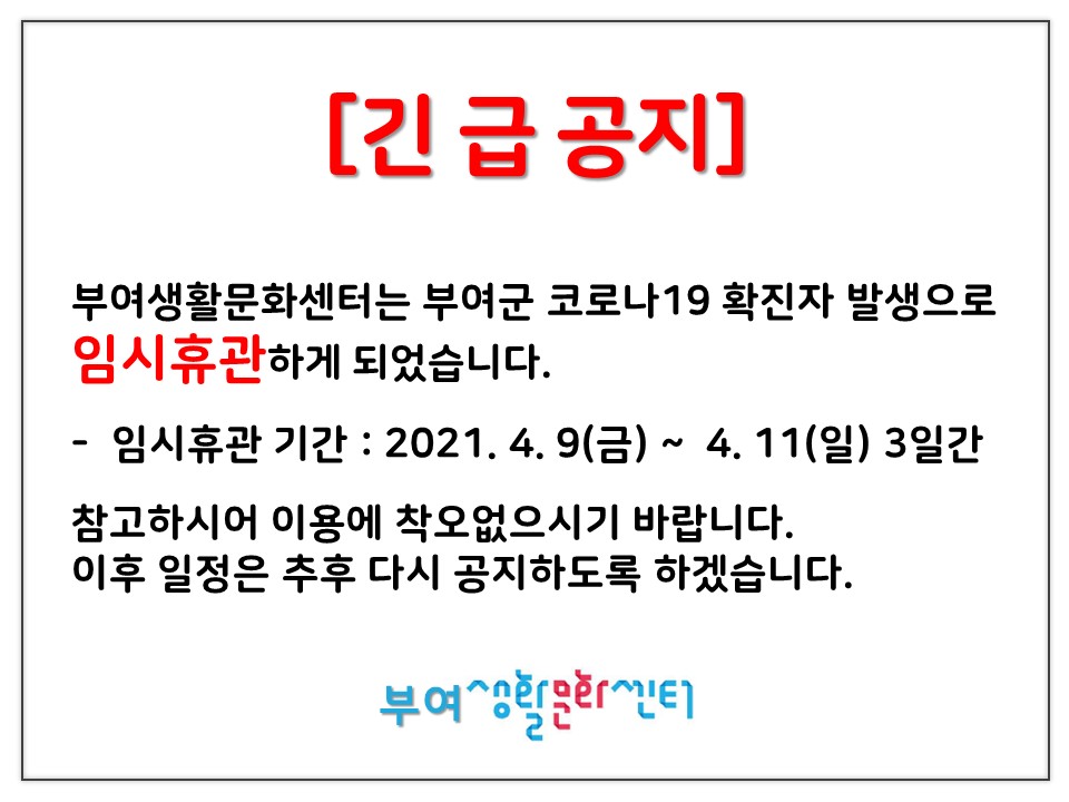 『 부여생활문화센터 임시 휴관 안내 』글의 상세내용을 확인하는 표로 제목, 작성자, 등록일, 조회, 첨부, 내용으로 나뉘어 설명합니다.