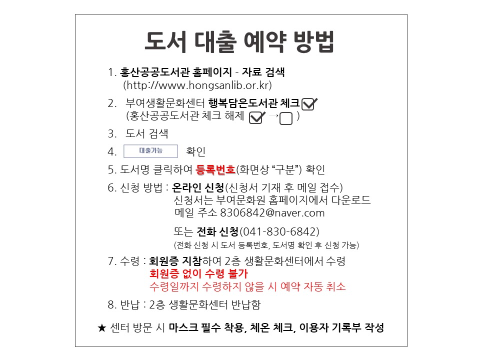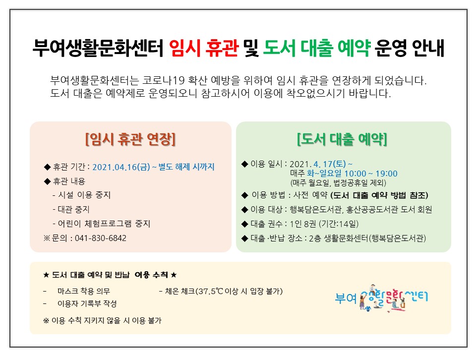 | 제목 | 부여생활문화센터 임시 휴관 및 도서 대출 예약 안내 | ||||