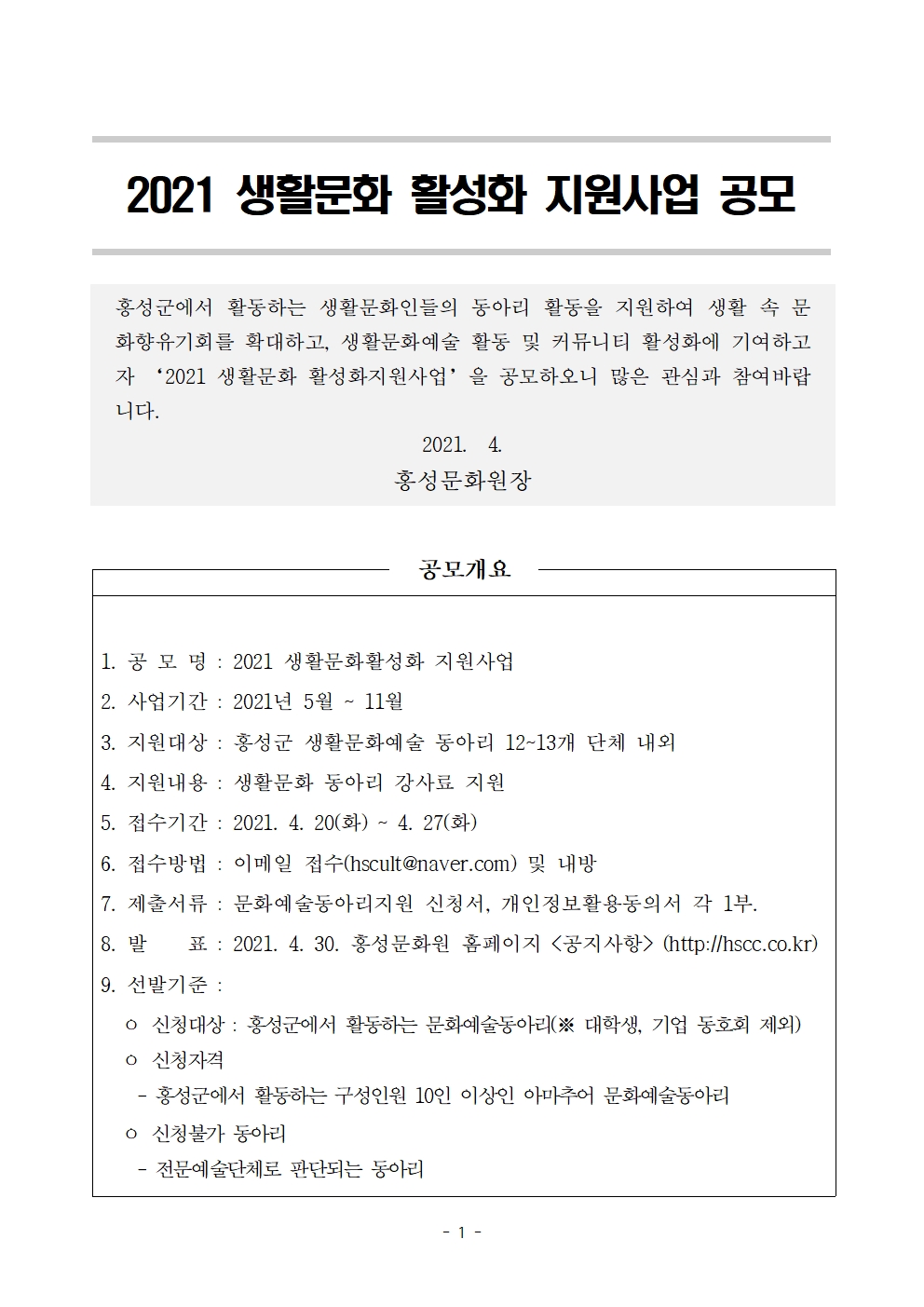 | 제목 | [공고문] 2021 생활문화 활성화 지원사업 공모 안내 | ||||