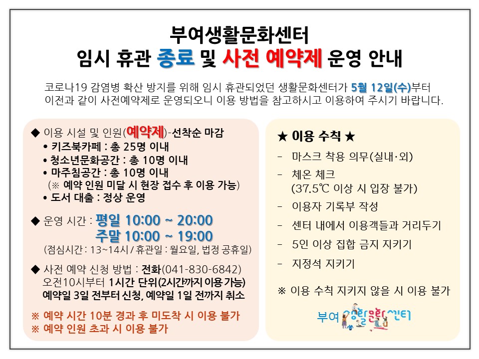 『 부여생활문화센터 임시 휴관 종료 및 사전 예약제 운영 안내 』글의 상세내용을 확인하는 표로 제목, 작성자, 등록일, 조회, 첨부, 내용으로 나뉘어 설명합니다.