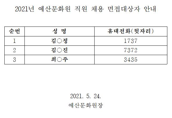 『 예산문화원 직원 채용 면접심사 대상자 알림 』글의 상세내용을 확인하는 표로 제목, 작성자, 등록일, 조회, 첨부, 내용으로 나뉘어 설명합니다.