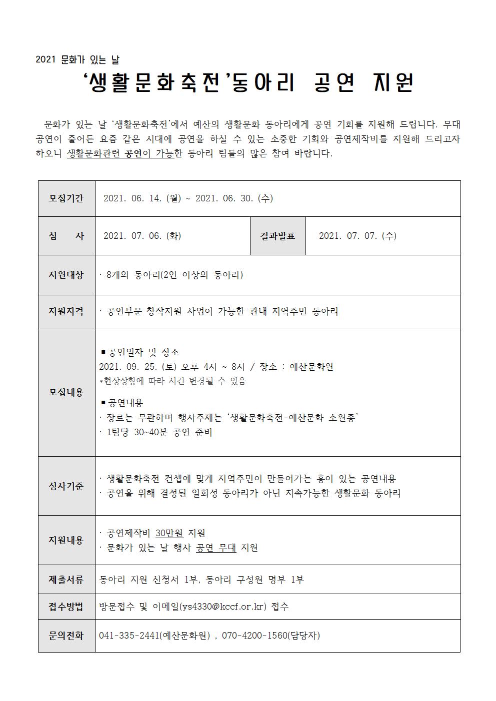 | 제목 | 2021 문화가 있는 날 '생활문화축전' 동아리 공연 지원 사업 공고 | ||||