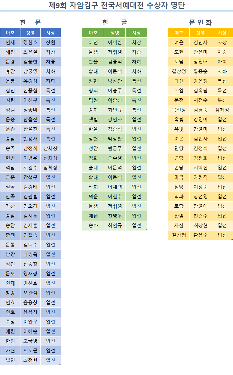 | 제목 | [제9회 자암김구 전국서예대전] 심사결과 및 추후일정안내 | ||||